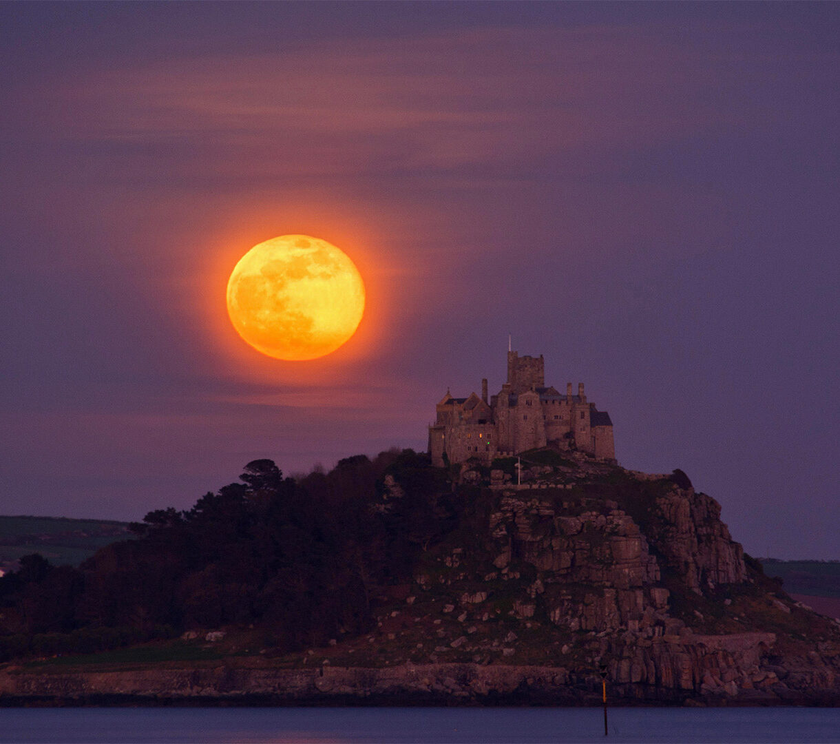 An ethereal 4K wallpaper showcasing a majestic island castle perched on a rocky outcrop, illuminated by the radiant 2017 April Pink Full Moon. The intensely bright, amber-hued full moon dominates the purplish-pink twilight sky, casting a serene glow that reflects softly on the calm water below.