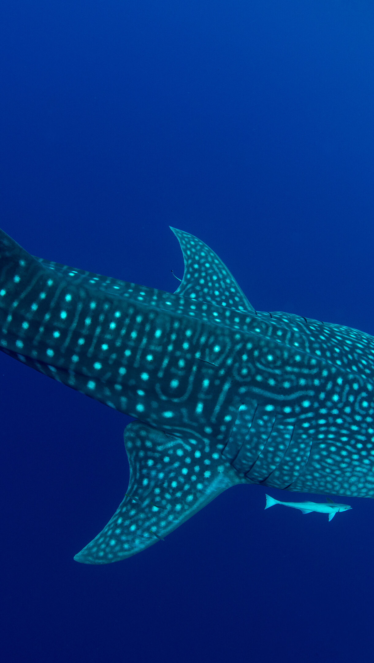 A majestic 4K wallpaper showcasing a whale shark gracefully navigating the pristine, deep blue waters of Cenderawasih Bay. Its massive body, intricately patterned with luminous white spots, creates a captivating contrast against the vast, dark ocean depths.
