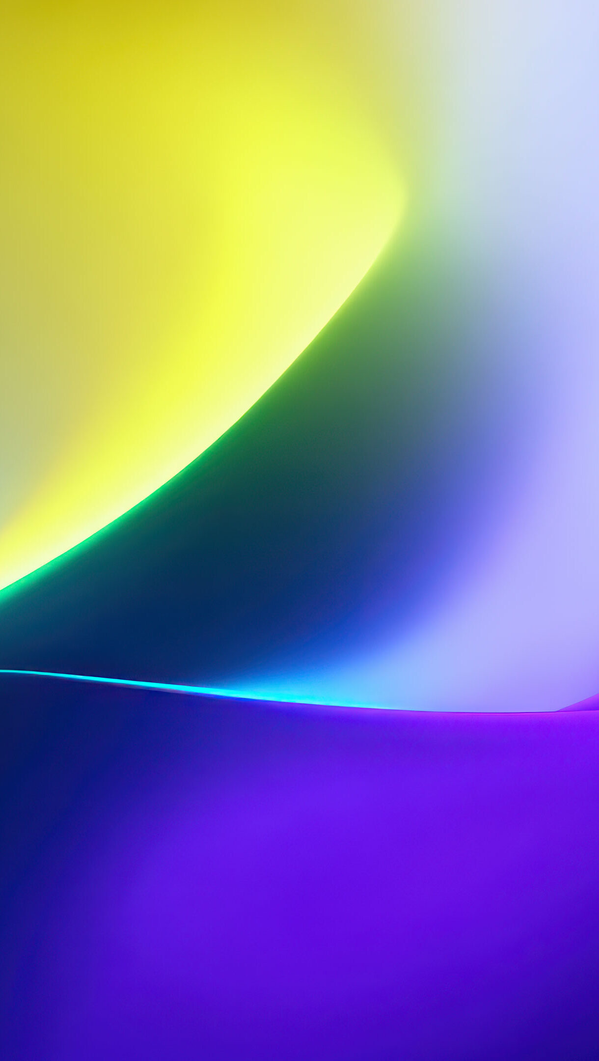 An expansive 4K wallpaper displaying abstract digitl art features graceful, flowing color gradient curves that traverse the visual field. Luminous transitions and undulating forms create a vibrant interplay of light and shadow, moving from brilliant yellow and cyan to deep, rich purples.