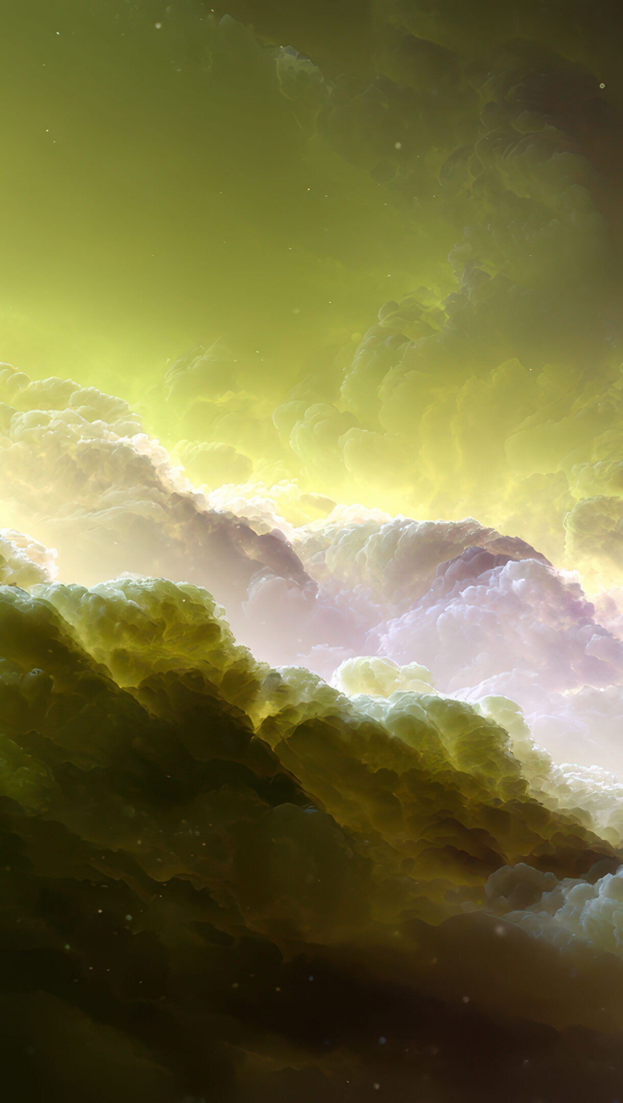 A magnificent 4K wallpaper of an abstract cosmic cloud formation, stretching across a vast ethereal setting. The vibrant yellow light intensifies the glowing textures of the clouds on the left, dramatically fading into deep purple shadows on the right, creating an otherworldly, majestic mood.