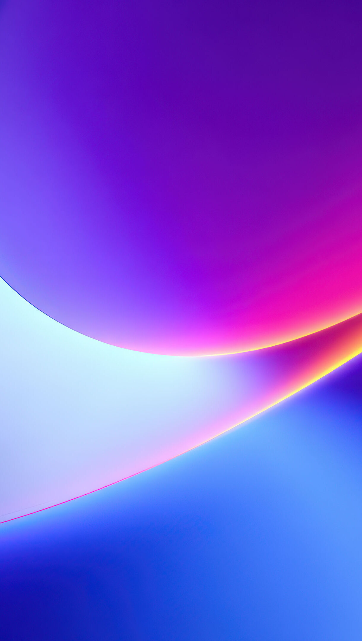 A captivating 4K wallpaper presents a dynamic abstract digital art composition featuring smooth, sweeping curves. Vivid gradients transition from soft lavender and sky blue to deep royal blue and magenta, highlighted by a luminous golden-orange edge that defines a prominent arc.