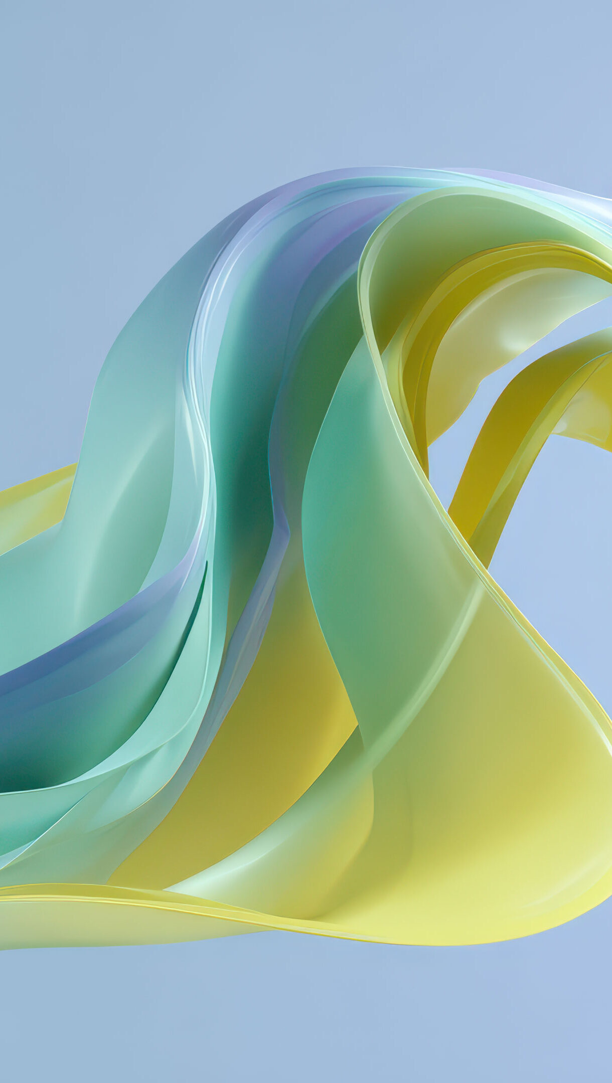 An exquisite 4K wallpaper showcasing abstract flowing pastel ribbons in shades of green, yellow, and purple against a soft light blue background. These translucent ribbons gracefully intertwine, creating gentle waves and luminous highlights that define a serene and ethereal mood.