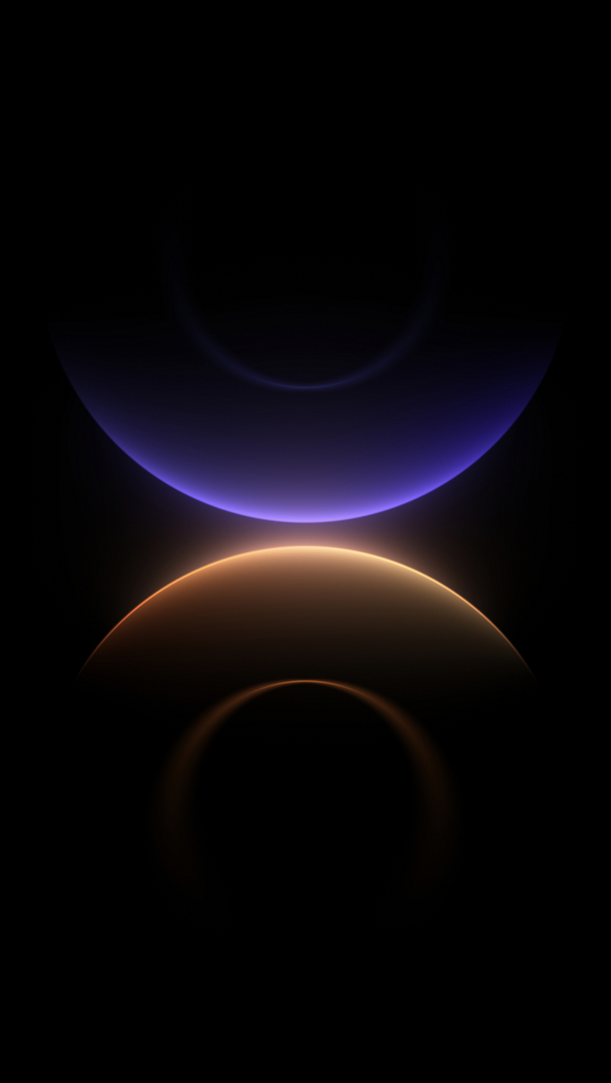 A deep 4K wallpaper highlights abstract glowing purple and orange rings, subtly positioned against a profound dark background. The ethereal glow from these distinct upper purple and lower orange arcs creates a mesmerizing, balanced composition, evoking a sense of cosmic serenity.
