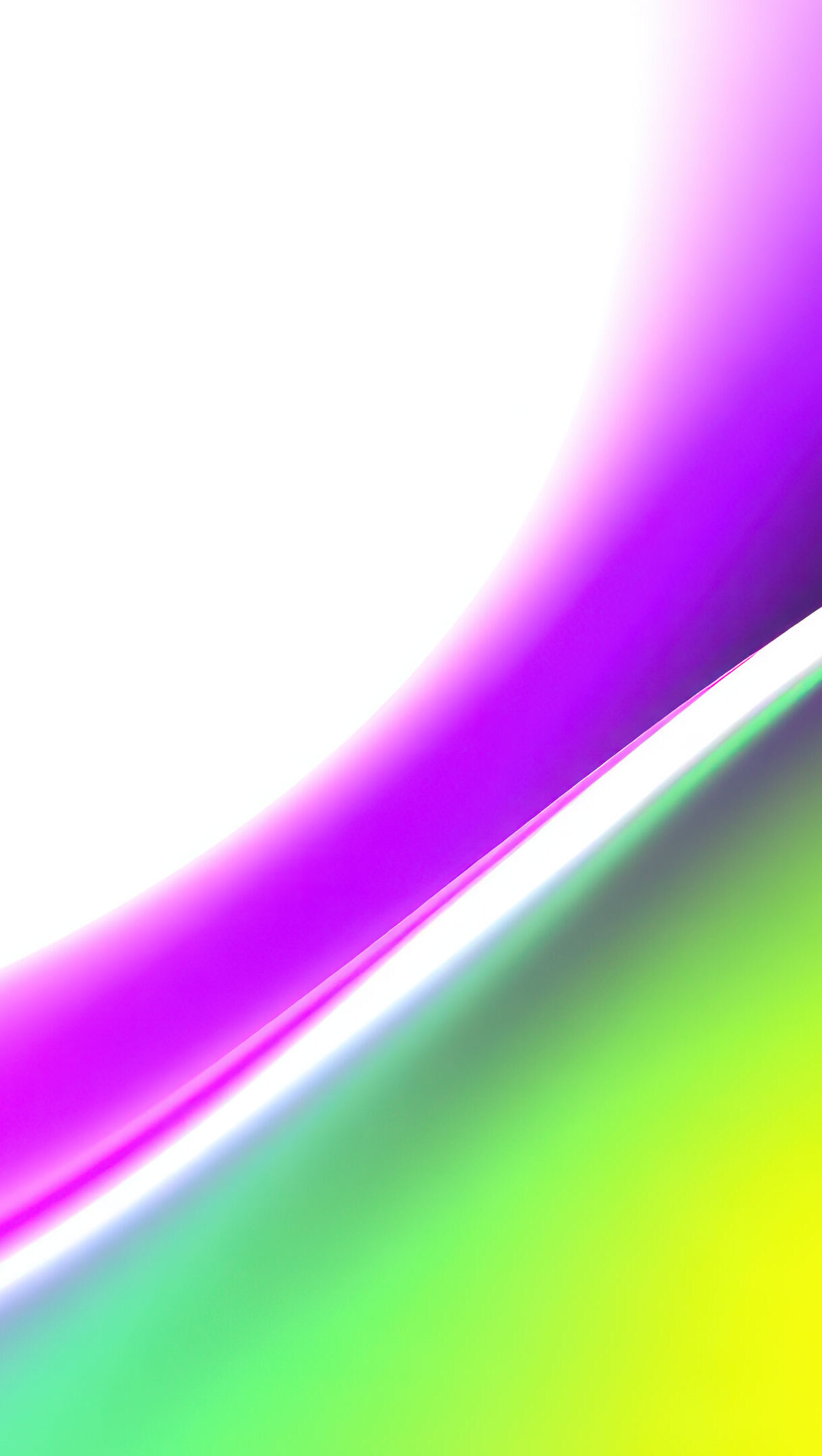 A mesmerizing 4K wallpaper capturing an abstract gradient background with vibrant purple, green, and yellow hues flowing against a crisp white space. A luminous, curving white line sharply delineates the radiant color progression, creating a sense of fluid motion and bright contrast.