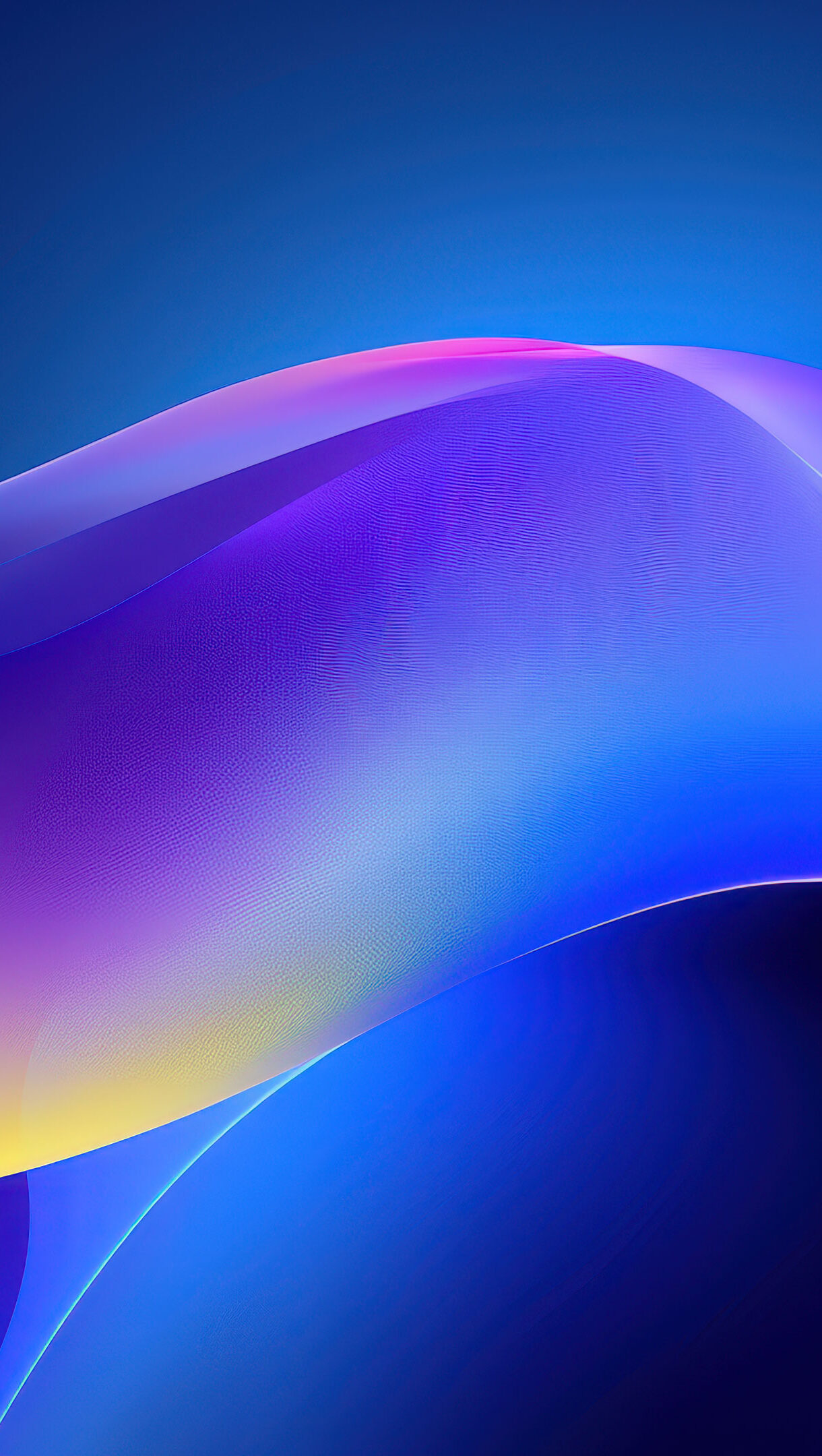 A mesmerizing 4K wallpaper features a grand, flowing abstract gradient wave of digital art stretching across a deep, dark blue background. Its luminous, ethereal ribbons transition smoothly from vibrant purples and pinks to bright blues and a subtle touch of yellow, creating a serene yet dynamic visual journey.