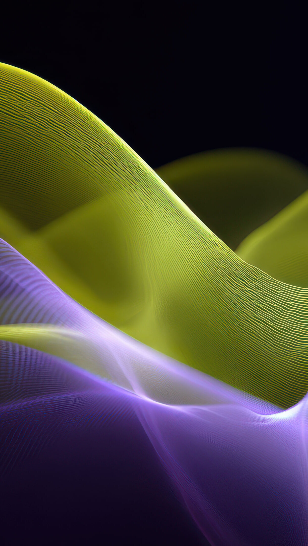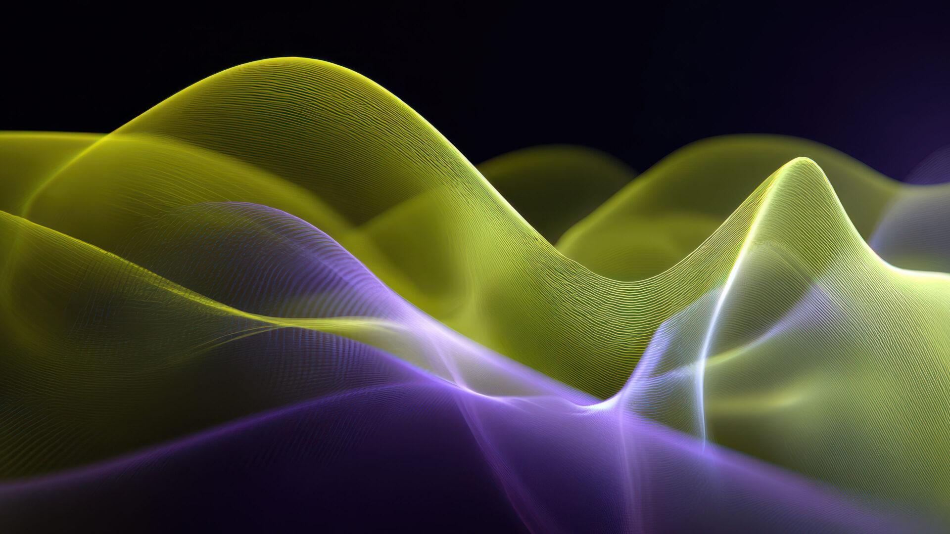 A futuristic 4K wallpaper presents undulating, luminous green and purple waves forming an abstract new dimension. Fine, glowing lines of chartreuse green and vivid purple crest and trough, highlighting the flowing motion and depth of this vibrant, otherworldly landscape.
