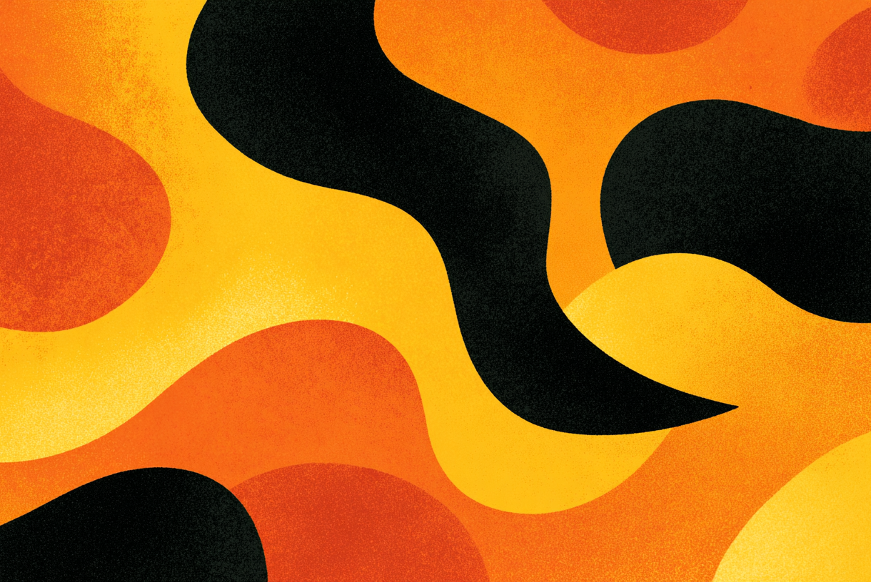 An artful 4K wallpaper displays abstract organic shapes, flowing across the entire frame. Vivid orange and golden yellow hues intermingle with bold black elements, all imbued with a subtle, cohesive grainy texture.