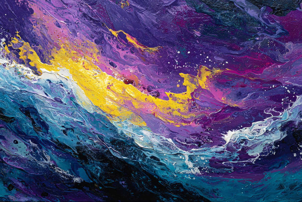 A mesmerizing 4K wallpaper showcases abstract paint swirls, predominantly in shades of purple, blue, and yellow, creating a fluid and dynamic composition. Bright streaks of yellow dramatically break through a flowing blend of deep purples and cool blues, creating a striking sense of energetic motion and vivid texture.