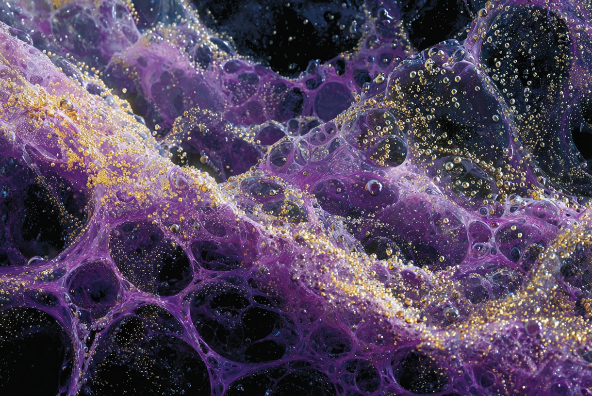 A captivating 4K wallpaper features an abstract landscape of interconnected purple liquid structures, forming a textured surface. Tiny, glistening gold bubbles and particles are embedded throughout the translucent purple matrix, creating a rich interplay of color, light, and depth that evokes a sense of cosmic fluidity.