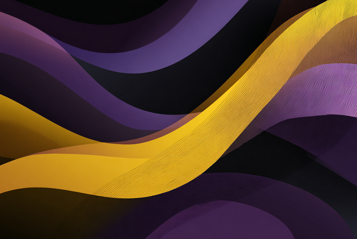 A dynamic 4K wallpaper of abstract purple and gold waves flowing across a dark background. The metallic gold bands, some textured with fine lines, dramatically sweep and intersect with varying shades of translucent purple curves, creating a fluid and sophisticated visual rhythm.