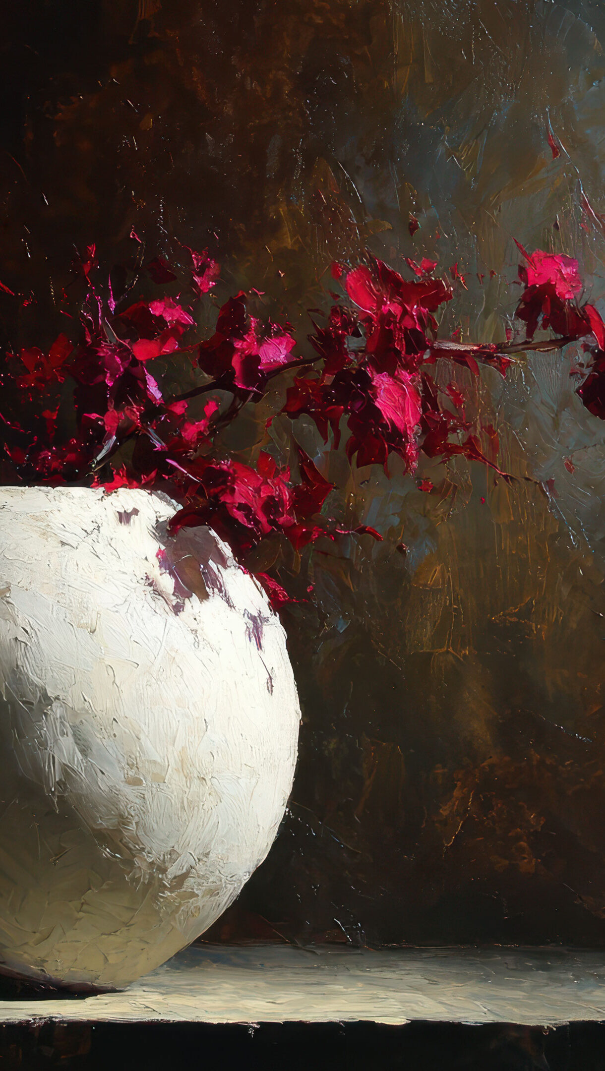 A striking 4K wallpaper presents an abstract realism minimalist still life painting, depicting vivid red flowers elegantly arranged in a textured white spherical vase on a dark surface. The composition’s bold impasto brushstrokes and the interplay of light and shadow against the richly mottled, somber background evoke a dramatic yet serene mood.
