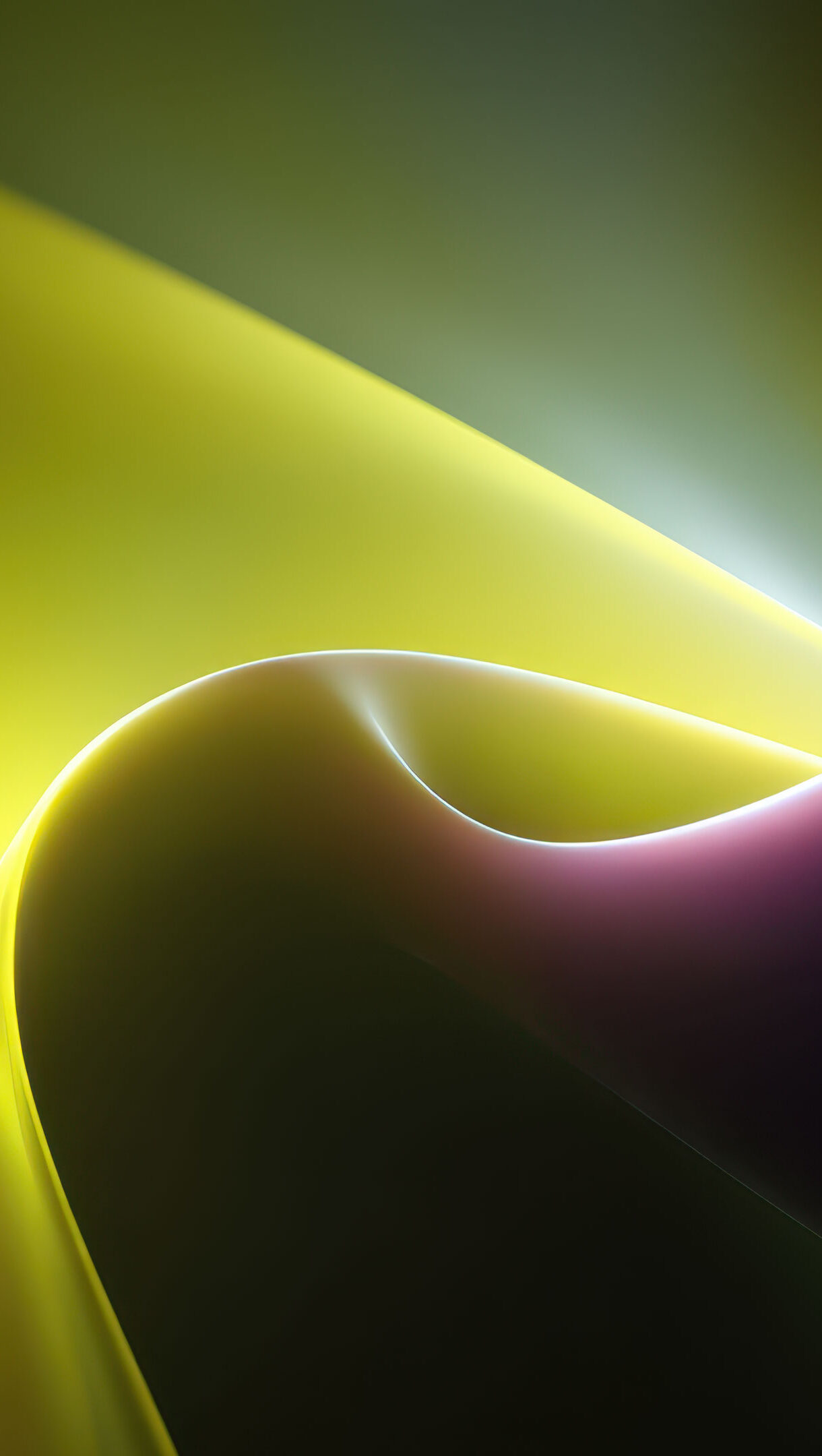 A dynamic 4K wallpaper presents an abstract smooth energy wave, beautifully rendered as digitl art. Luminous curves transition from vibrant chartreuse and gentle green into deep purples, highlighting the smooth, ethereal interplay of light and shadow.