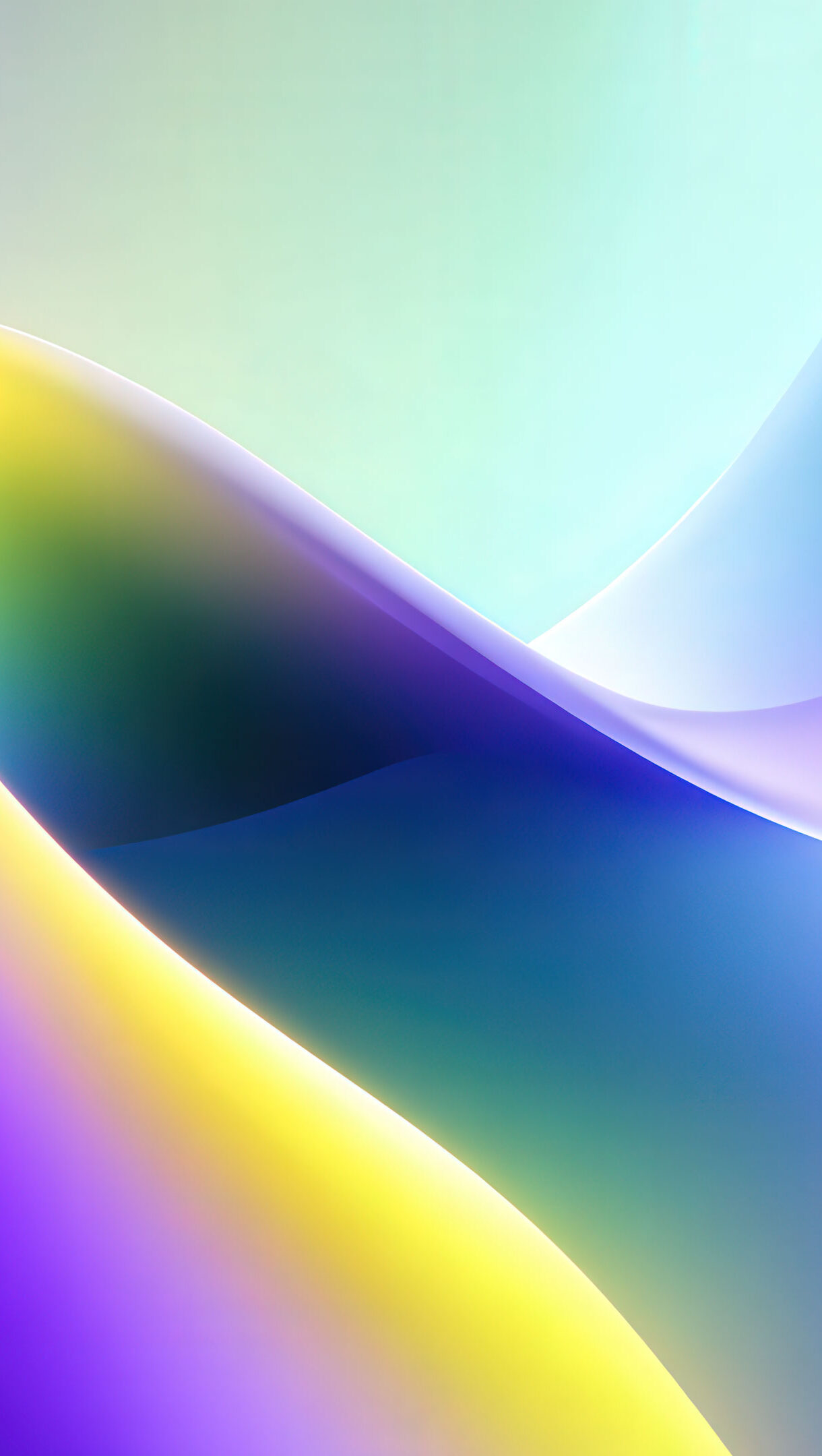 A vibrant 4K wallpaper showcasing smooth, colorful abstract curves flowing dynamically across a soft gradient background. Bright glowing edges highlight the graceful forms and the fluid interplay of purple, yellow, blue, and green gradient hues creates a sense of depth.