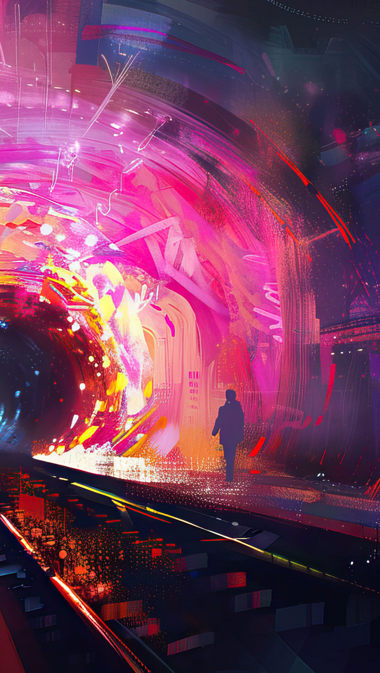 A stunning 4K wallpaper featuring abstract urban tunnel art with vibrant colors and geometric patterns. This digital artwork captures the essence of a modern cityscape, creating a visually striking and futuristic atmosphere, perfect for your desktop or mobile wallpaper.