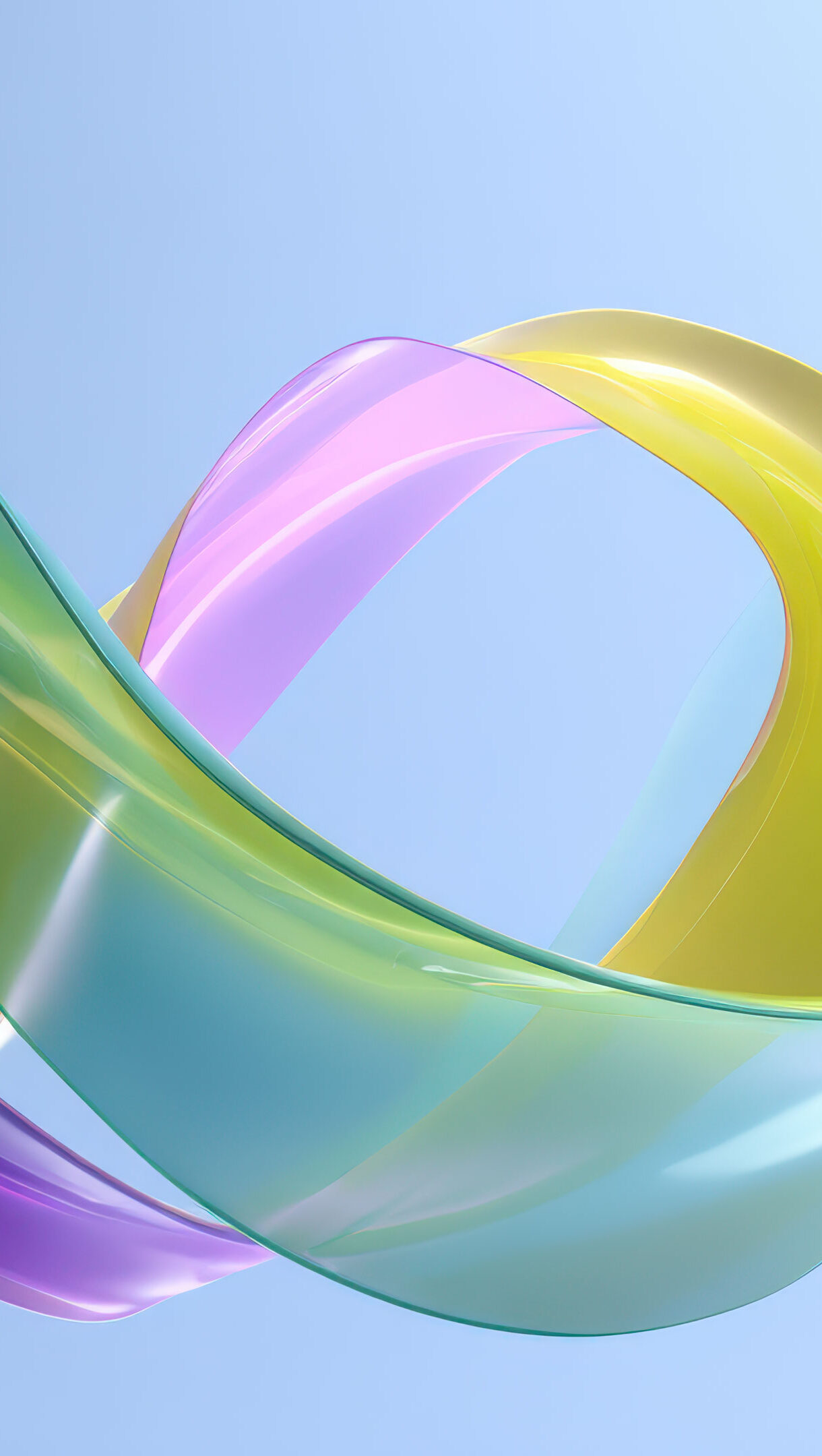 A captivating 4K wallpaper displays abstract volumetric ribbons, designed as a Windows 11 background, flowing gracefully in soft yellow, purple, and teal across a serene light blue backdrop. The glossy, flowing forms exhibit a beautiful interplay of light and shadow, highlighting their translucent qualities and creating an ethereal, modern mood.
