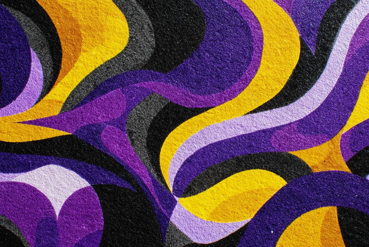 A vibrant 4K wallpaper showcases an abstract design of smoothly undulating, organic waves covering the entire frame. The pattern features intertwining broad bands of vivid purple, golden yellow, dark black, and various shades of gray, all rendered with a tactile, slightly grainy texture that enhances its dynamic flow.