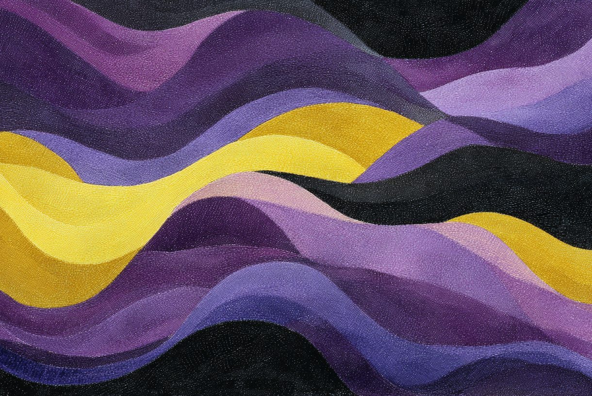 A mesmerizing 4K wallpaper showcases abstract wavy forms flowing horizontally across a textured canvas. The undulating bands feature a visible, finely dotted surface, with bright yellow curves contrasting vibrantly against the deep purples and stark blacks, creating a dynamic and rich visual mood.