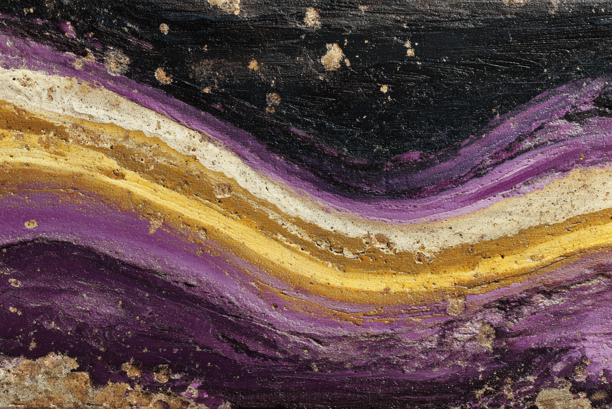 A captivating 4K wallpaper reveals an abstract composition featuring bold, wavy textures of purple, gold, and off-white flowing across a dark black expanse. The rich, uneven surfaces of the paint create a raw, layered depth, where the vibrant purples and golds appear to emerge from the darker tones with a palpable, energetic motion.