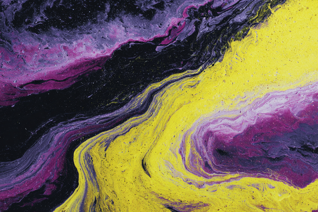A captivating 4K wallpaper of abstract yellow, purple, and black fluid art. Vivid yellow streams swirl against deep purple and black expanses, creating a textured, cosmic-like flow with fine speckles that enhance its vibrant, dynamic mood.