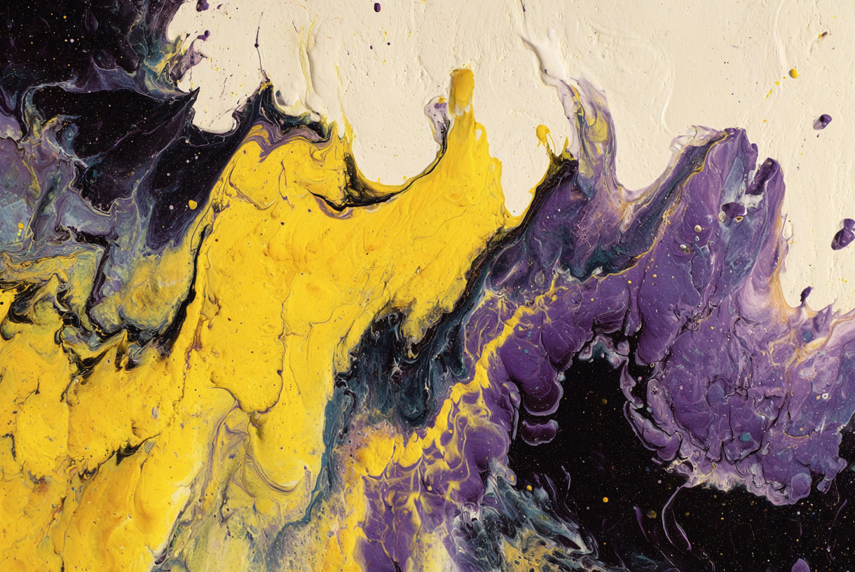 This striking 4K wallpaper embodies an abstract fluid art composition, where vibrant yellow and deep purple paints swirl dramatically across contrasting black and off-white areas. Thick, tactile textures and fine paint speckles create a dynamic visual flow, highlighting the energetic interplay and harmonious blending of these intense hues.