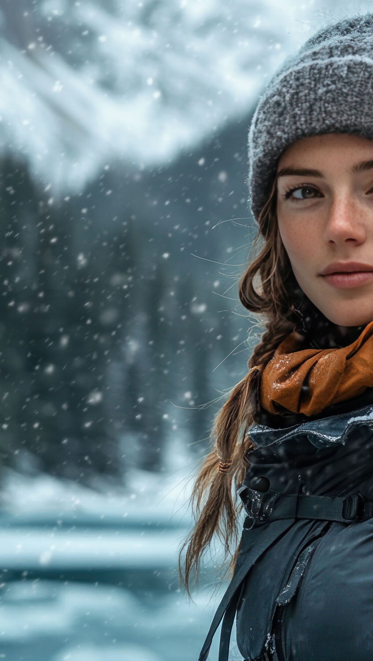 A stunning 4K wallpaper featuring a lone adventurer trekking through the snowy mountains. Towering, frost-covered peaks rise against a crisp winter sky, while the traveler, clad in cold-weather gear, braves the icy terrain. The untouched snow glistens under the soft light, evoking a sense of solitude and exploration in the vast wilderness.