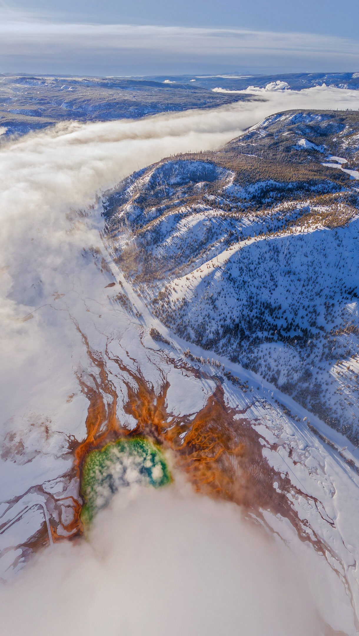 Aerial Grand Prismatic Spring Winter Fog Yellowstone National Park Wallpaper