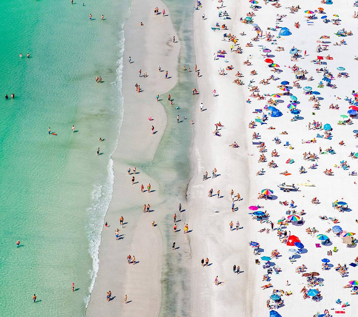 An expansive 4K wallpaper showcases an aerial view of the crowded Siesta Key Florida shoreline, teeming with beachgoers on pristine white sand and in turquoise water. The vibrant interplay of countless colorful umbrellas and tiny figures against the clear, inviting green-blue ocean defines a lively, joyful summer atmosphere.