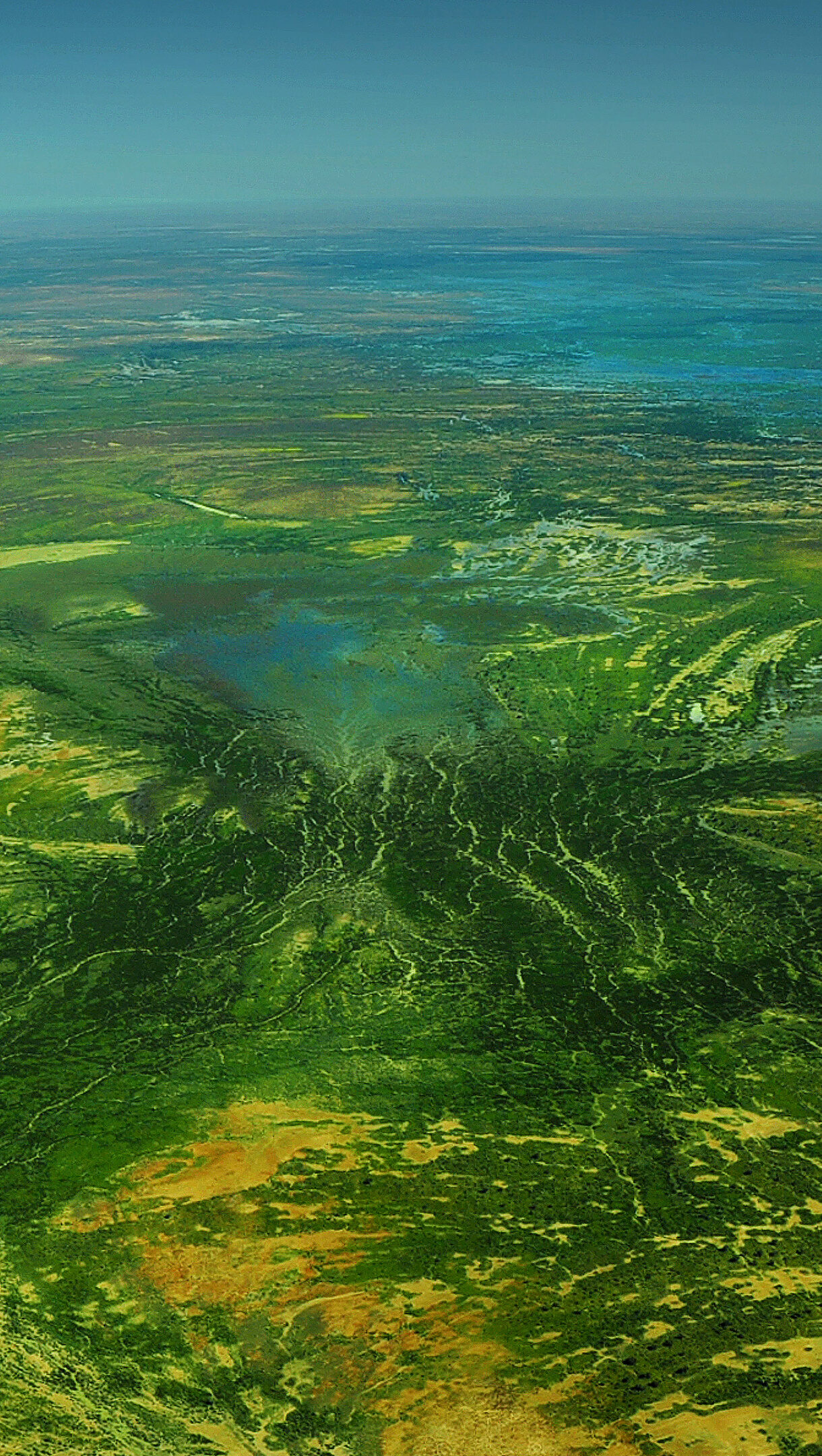 A mesmerizing 4K wallpaper offers an expansive aerial view of the Channel Country in Outback Queensland, Australia, revealing a vast landscape of interconnected watercourses and diverse terrain. Intricate patterns of vibrant green vegetation, ochre earth, and shimmering blue water form a dramatic, organic tapestry under a clear blue horizon.
