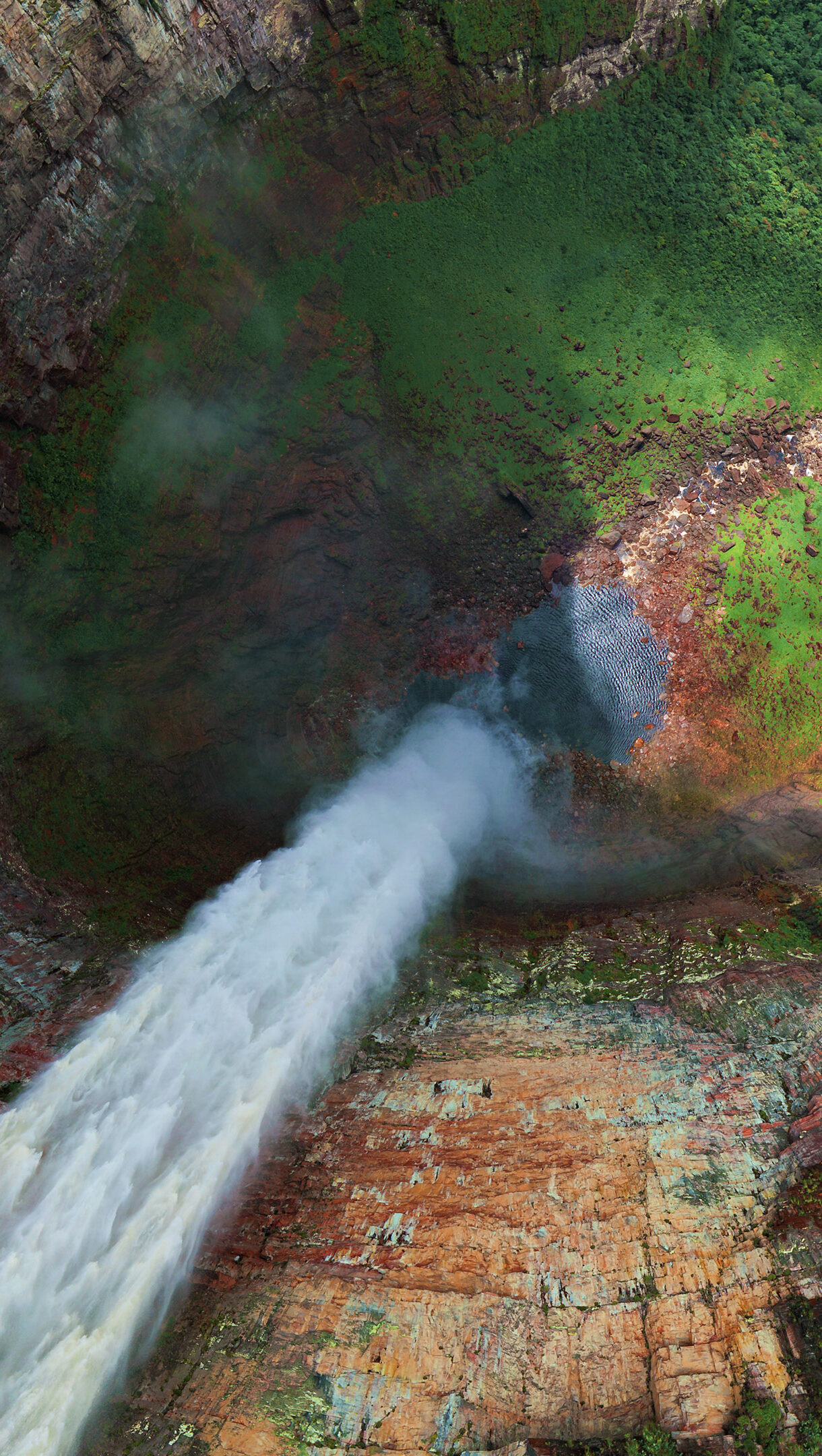 An immersive 4K wallpaper presents an aerial view of the majestic Churún Merú Waterfall in Venezuela, plunging into a deep, verdant canyon. The powerful white cascade dramatically contrasts with the rich red and orange stratified rock walls on one side and lush green foliage blanketing the other, leading to a winding river below.