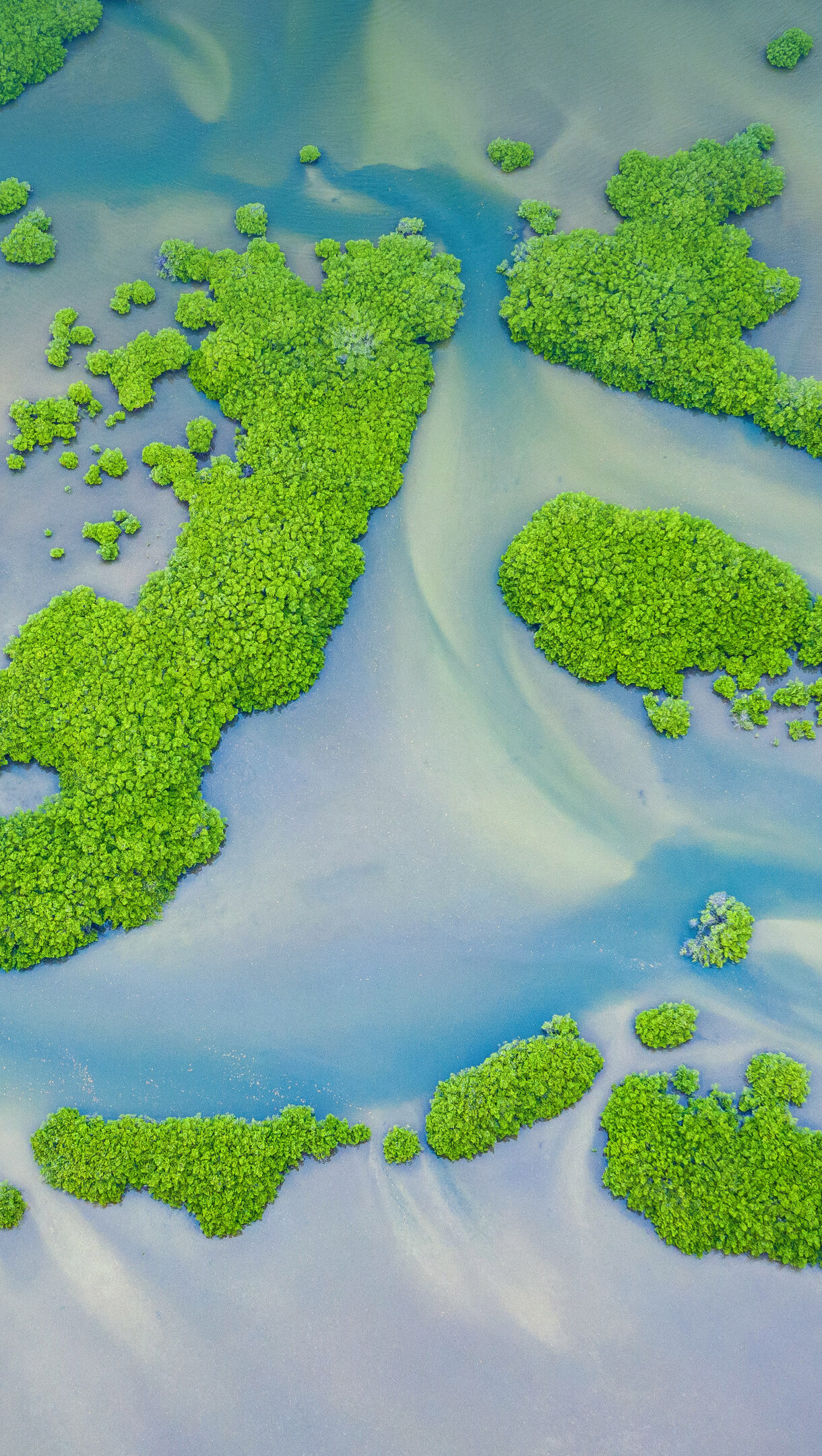 An exquisite 4K wallpaper captures an aerial view of the lush Mangrove Forest within Saloum Delta National Park in Senegal. The vibrant emerald green mangrove islands create an intricate, organic tapestry, vividly contrasting with the winding channels of pale blue and sandy gray delta waters.