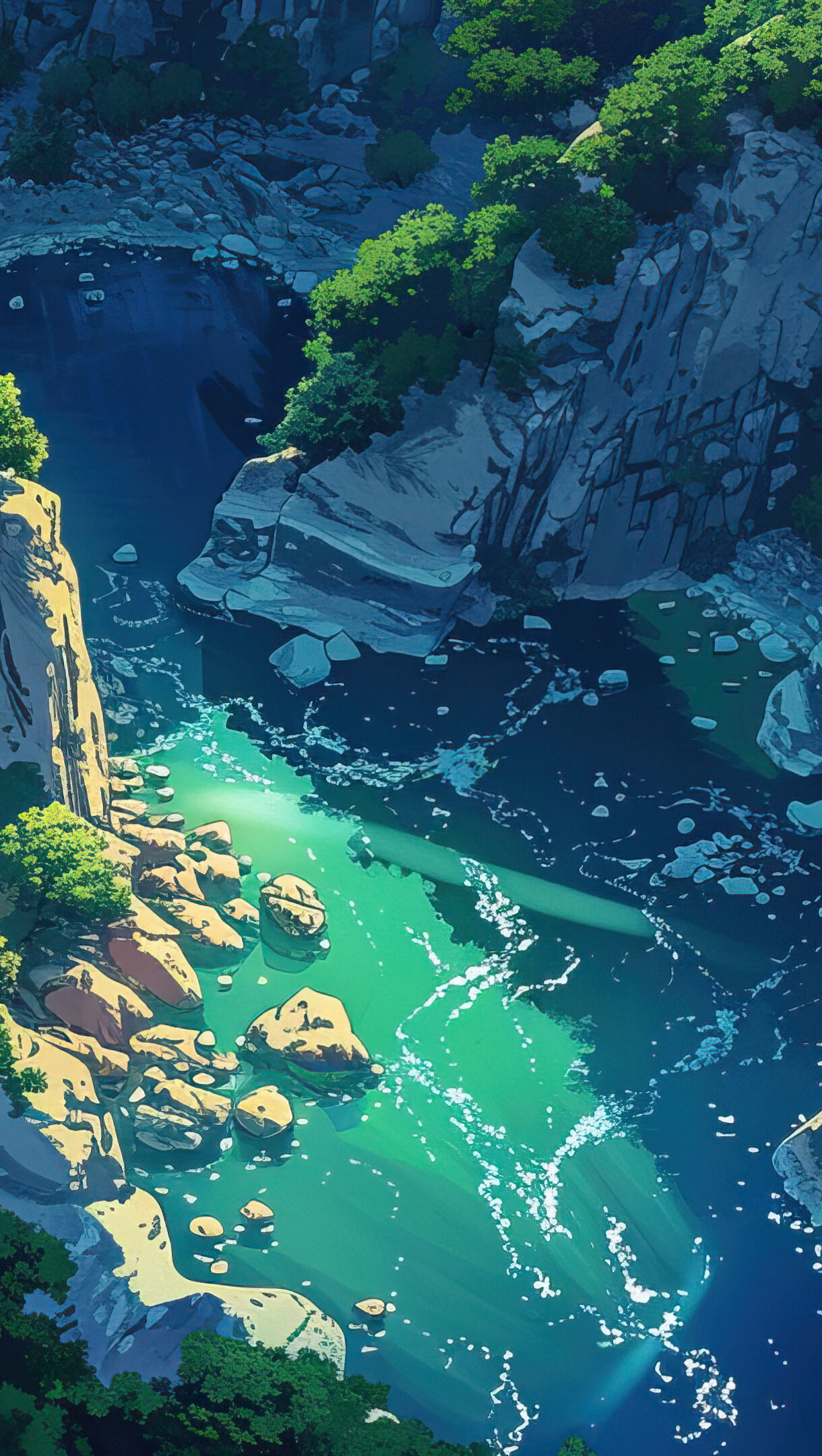 A stunning 4K wallpaper featuring an aerial view of a tranquil river gorge. The serene landscape showcases a peaceful river winding through lush greenery, creating a picturesque and calming scene perfect for your desktop or mobile background.