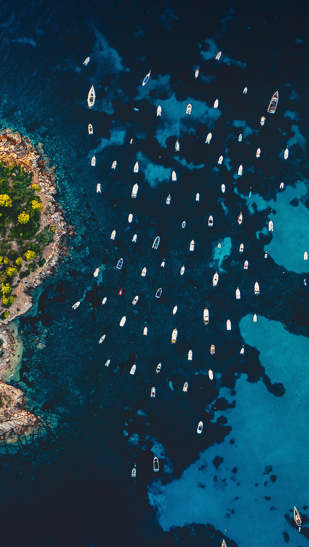 An breathtaking 4K wallpaper showcasing an aerial view of Pantaleu Island off the coast of Sant Elm, Mallorca, Spain. The deep blue and bright turquoise waters surrounding the rocky, green-covered island are strikingly contrasted by a multitude of white boats and the densely packed coastal buildings of Sant Elm.