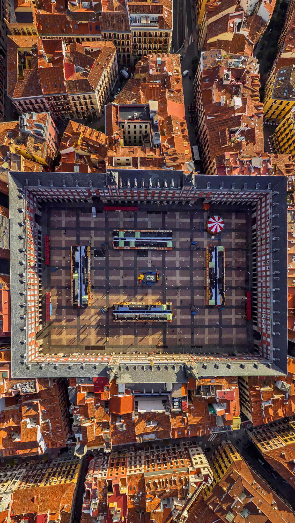 A breathtaking 4K wallpaper presenting an aerial view of Madrid's Plaza Mayor, centrally located within a sprawling Spanish cityscape. The vibrant terracotta rooftops and intricate urban grid are sharply defined by bright sunlight, creating a dynamic visual tapestry.