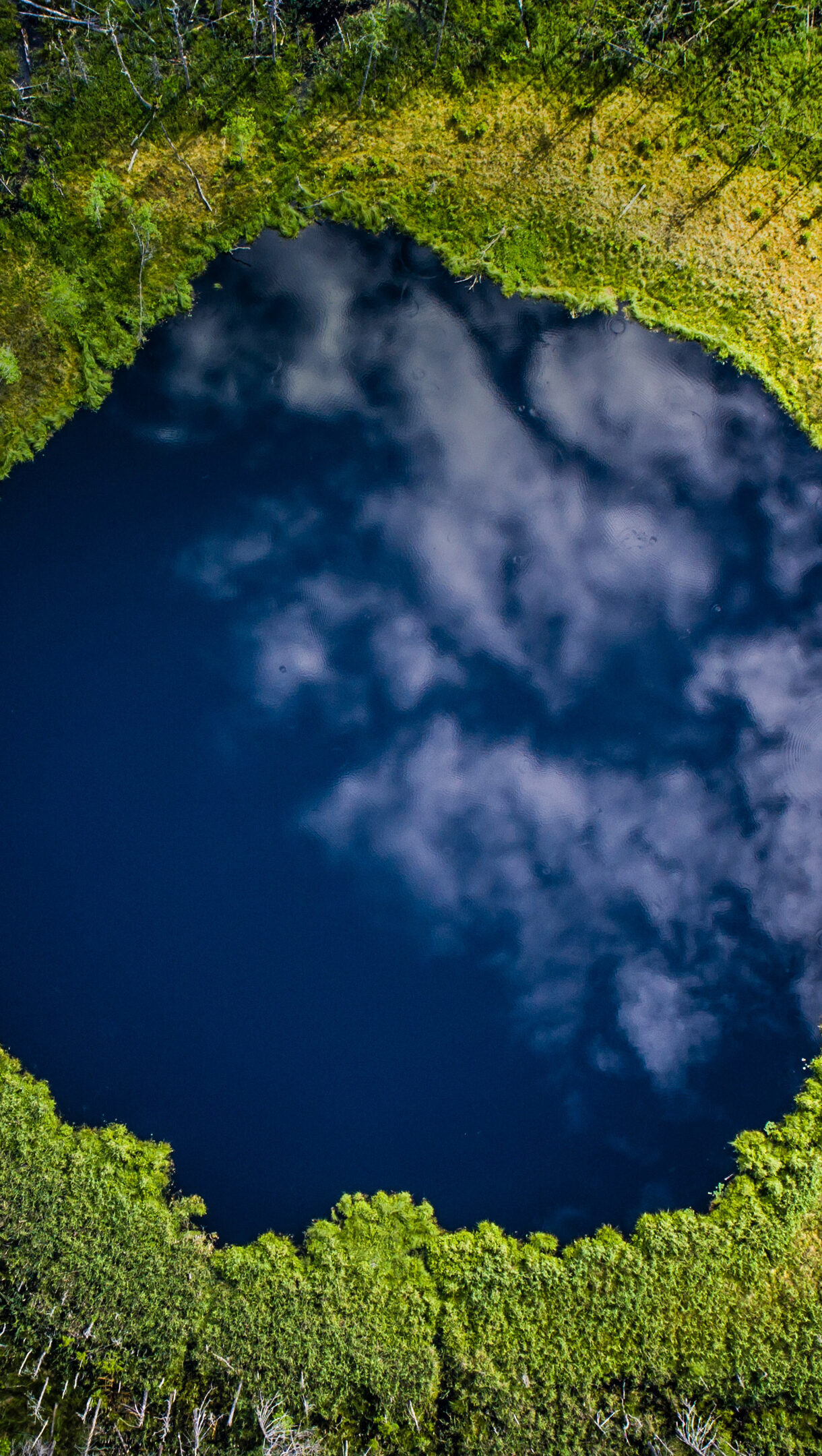 A mesmerizing 4K wallpaper presenting an aerial view of a small, dark blue lake nestled within the diverse forest and wetland of Karula National Park, Estonia. The lake's deep, almost black surface vividly reflects bright white clouds, creating a stark contrast with the surrounding vibrant green and golden-hued marshland, and the scattered stark white skeletal trees of the dense forest.