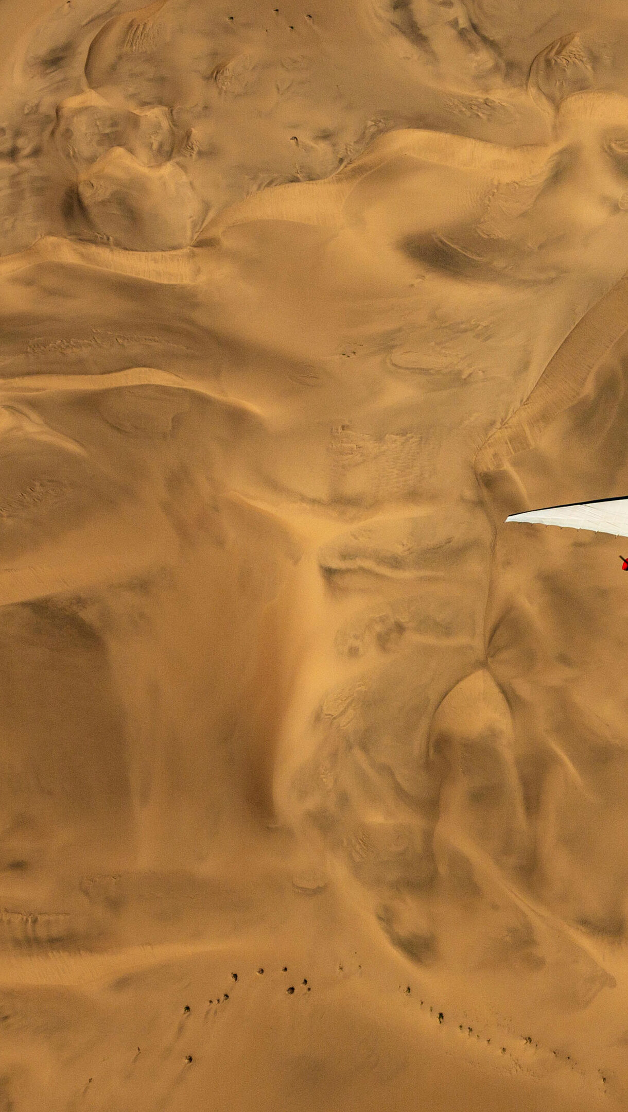 A breathtaking 4K wallpaper showcasing an ultralight aircraft soaring above the vast, golden sands of Namibia. The white ultralight stands out vividly against the endless, richly textured golden dunes, sculpted by light and shadow into mesmerizing abstract patterns.