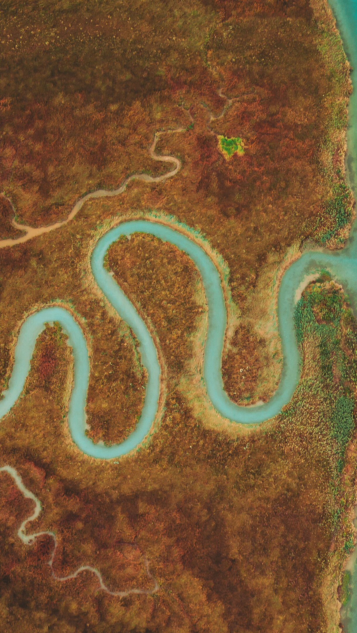 A captivating 4K wallpaper unveils an aerial view of the Venetian Lagoon's intricate turquoise delta waterways winding through a rust-toned marshland. The vibrant turquoise of the winding delta channels and the broad lagoon contrasts dramatically with the rich, rust-colored marsh, where a lone white boat leaves a crisp wake.