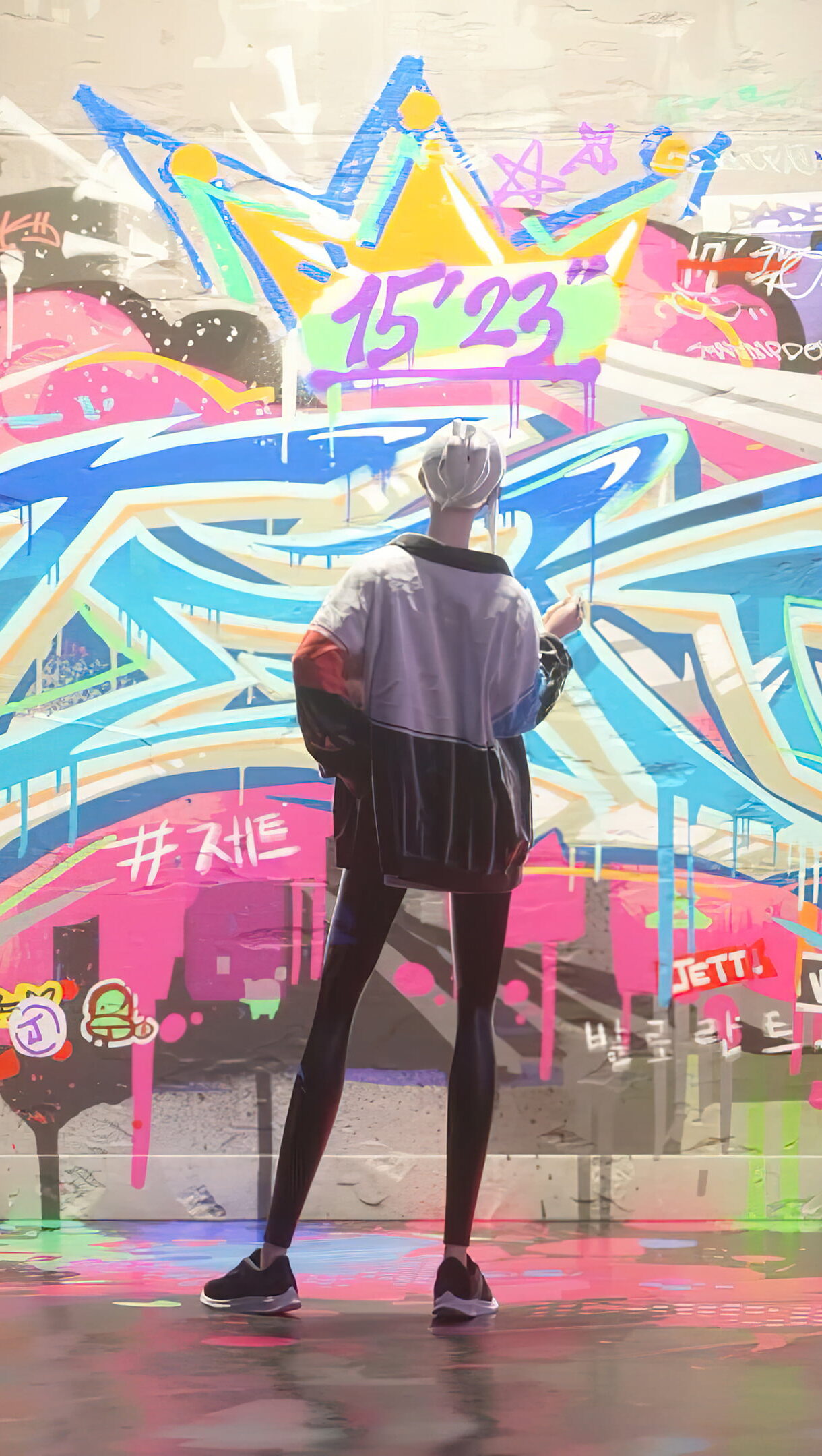 A vibrant and exciting 4K wallpaper featuring Agent Jett from Valorant in a graffiti-themed artwork. Jett, the agile duelist, stands out with colorful and energetic graffiti elements around her. Simply click the download button to bring this masterpiece to life on your screen as a desktop wallpaper or save it for later in your picture collection.