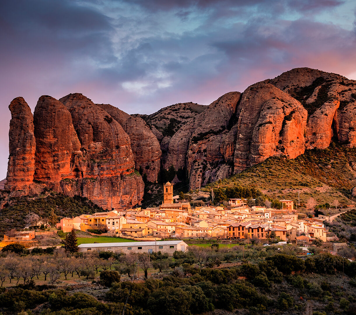 A majestic 4K wallpaper portraying Agüero, a Spanish village nestled beneath imposing rock formations in a vast, picturesque landscape. The scene is bathed in the warm, golden-orange light of a sunset, dramatically highlighting the vertical cliffs and infusing the sky with hues of deep blue and soft pink.