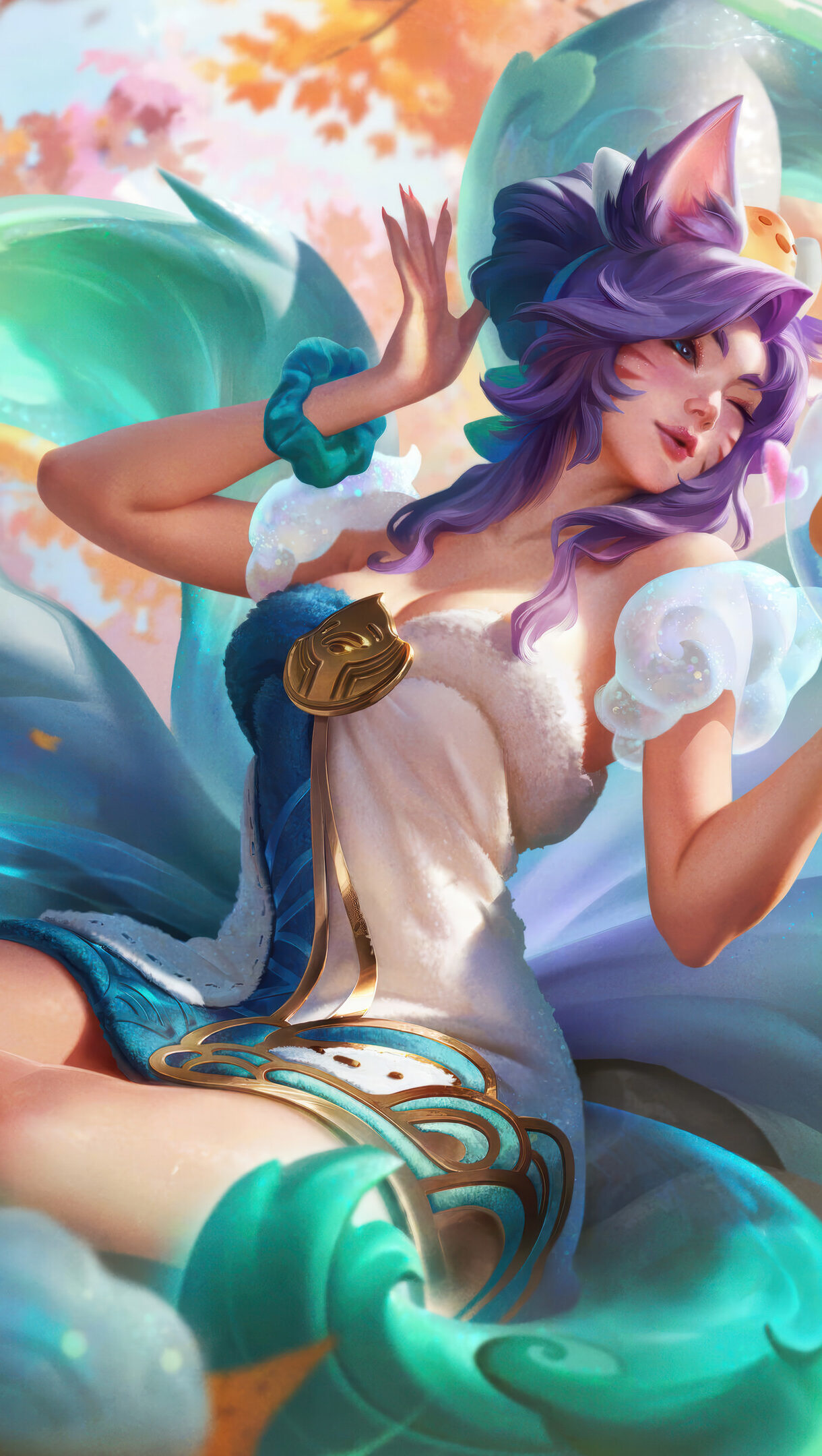 A whimsical 4K wallpaper captures Ahri, the fox spirit, gracefully lounging in a vibrant traditional East Asian garden adorned with autumnal trees and delicate bubbles. Her nine luminous teal tails elegantly flow around her, complementing her playful, winking expression that exudes a dreamlike serenity.
