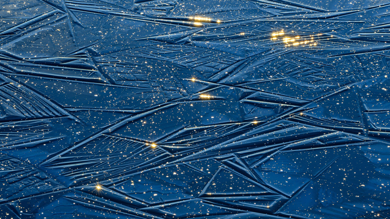 A dazzling 4K wallpaper showcasing the patterned blue ice of Alam-Pedja Nature Reserve in Estonia. Golden sunlight sprinkles across the deep blue surface, creating a magical, starry sparkle.