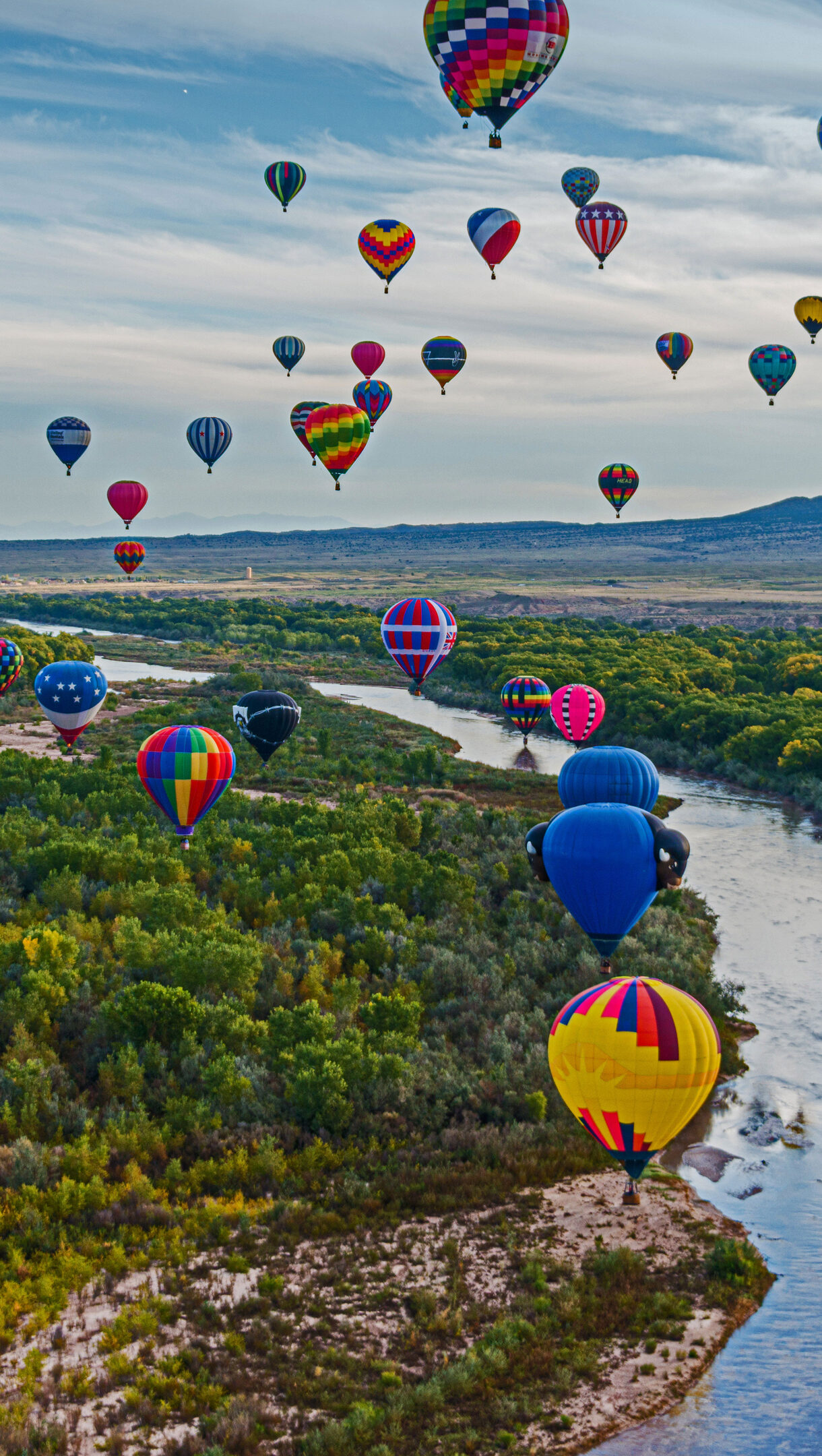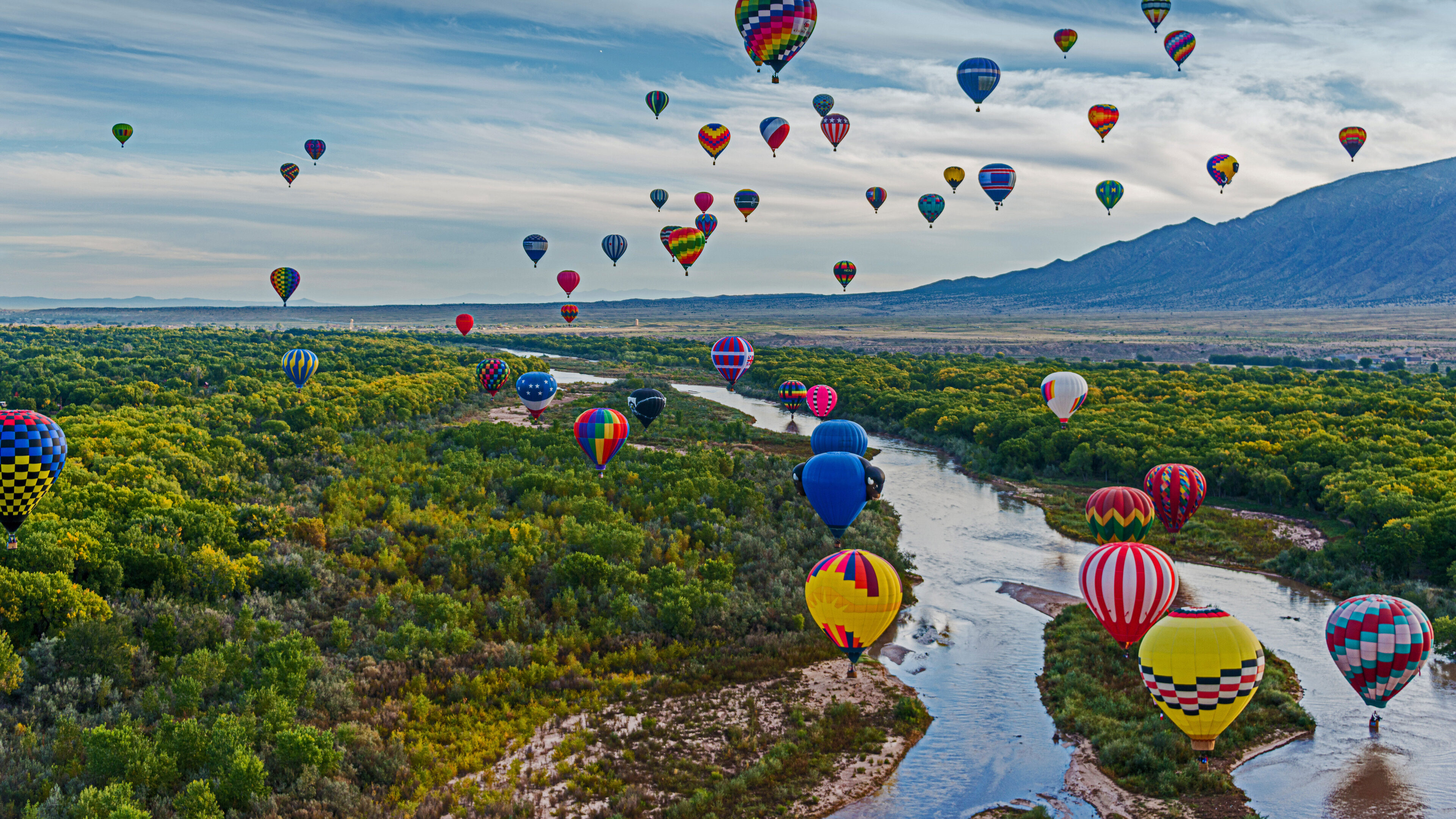 A majestic 4K wallpaper captures the Albuquerque International Balloon Fiesta, with numerous hot air balloons soaring over the winding Rio Grande, flanked by lush green trees and distant mountains. Their diverse patterns and brilliant colors create a breathtaking spectacle against the soft morning sky, reflecting a joyful and awe-inspiring atmosphere.