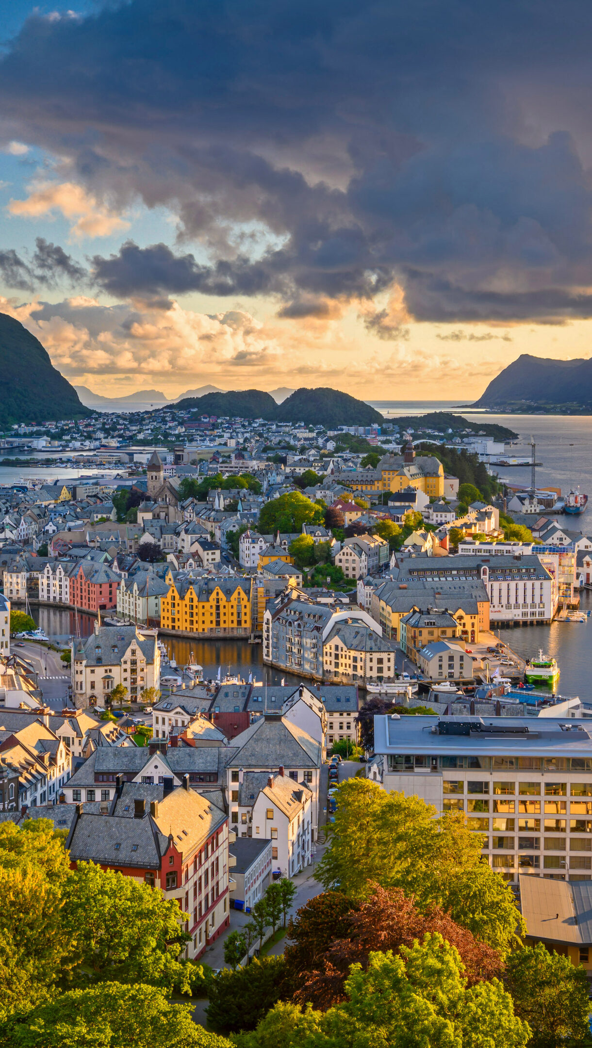 A captivating 4K wallpaper presenting Ålesund's distinctive Art Nouveau cityscape nestled amongst islands and fjords in Norway. The dramatic sunset bathes the scene in warm golden hues, highlighting the colorful buildings and reflecting vividly off the calm harbor waters, creating a serene and picturesque mood.