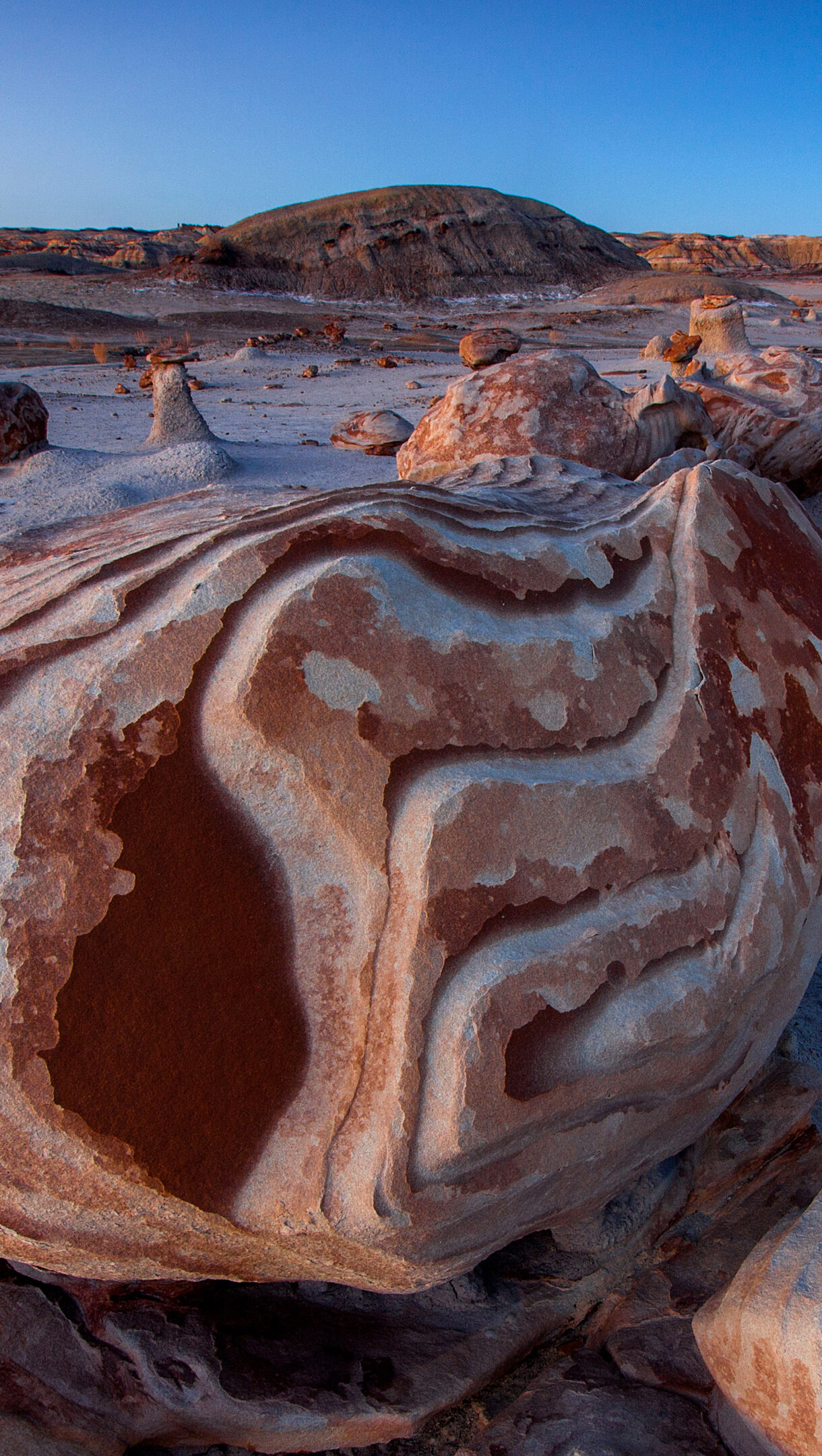A mystical 4K wallpaper revealing the 'Alien Egg Hatchery' formations nestled within the Bisti De-Na-Zin Wilderness desert landscape. The striking wavy patterns of ochre and white on the large, egg-like rock in the foreground contrast with the cool, sandy ground and pale blue sky, creating a serene yet enigmatic atmosphere.