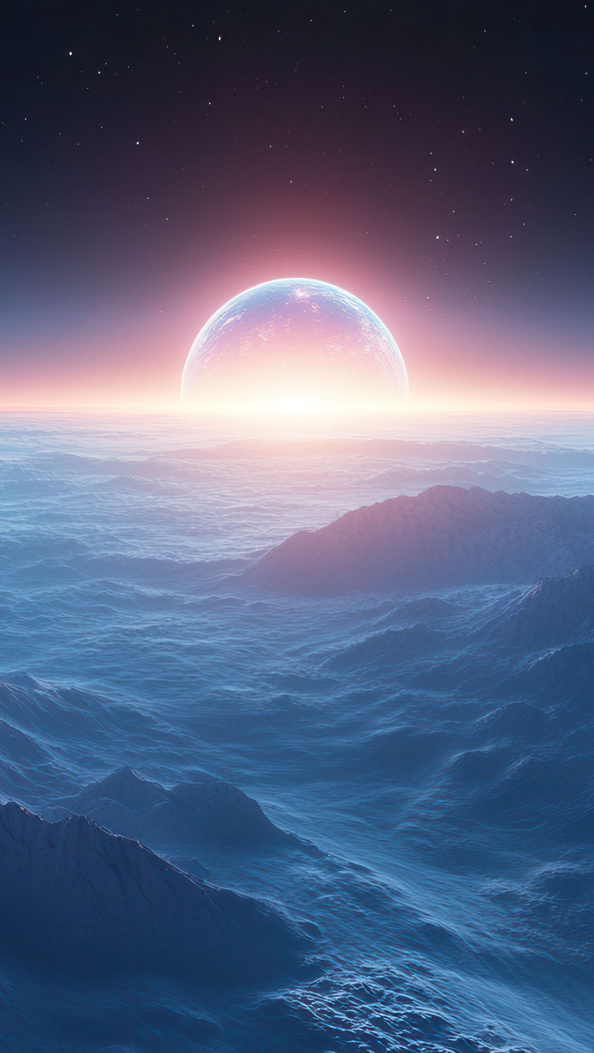 A stunning 4K wallpaper featuring an alien planet’s sunrise casting a golden glow over towering icy mountains. The surreal extraterrestrial landscape, with its frozen peaks and vibrant sky, creates a mesmerizing sci-fi scene, perfect for desktop and mobile backgrounds.