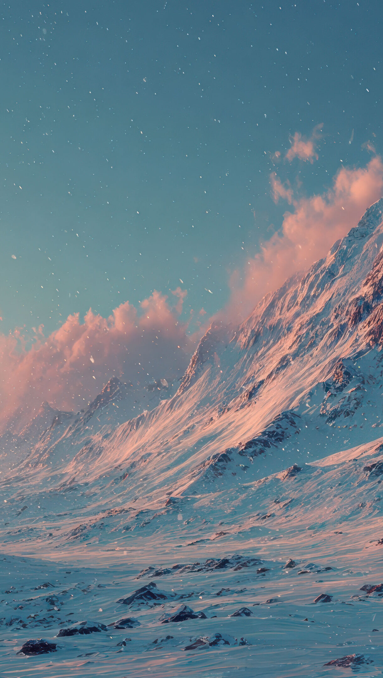 A mesmerizing 4K wallpaper depicts an otherworldly alien snowy mountain range at sunset. Gentle snowfall drifts across the vast landscape, bathed in the dramatic interplay of a glowing pink-orange sun against the cool blue twilight.