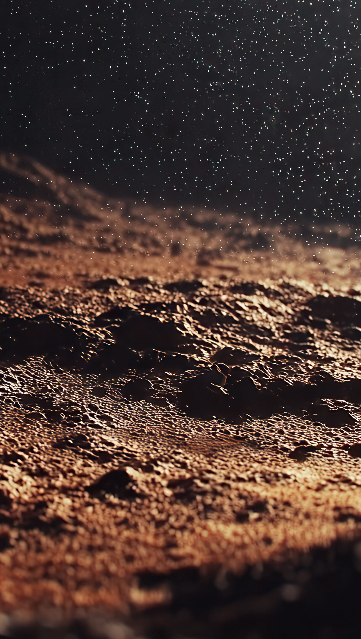 A breathtaking 4K wallpaper showcasing the rough, reddish surface of an alien world under a dense blanket of countless stars. The harsh textures of the rocky ground are dramatically lit by the distant cosmic light, emphasizing the stark beauty and vastness of this extraterrestrial landscape.