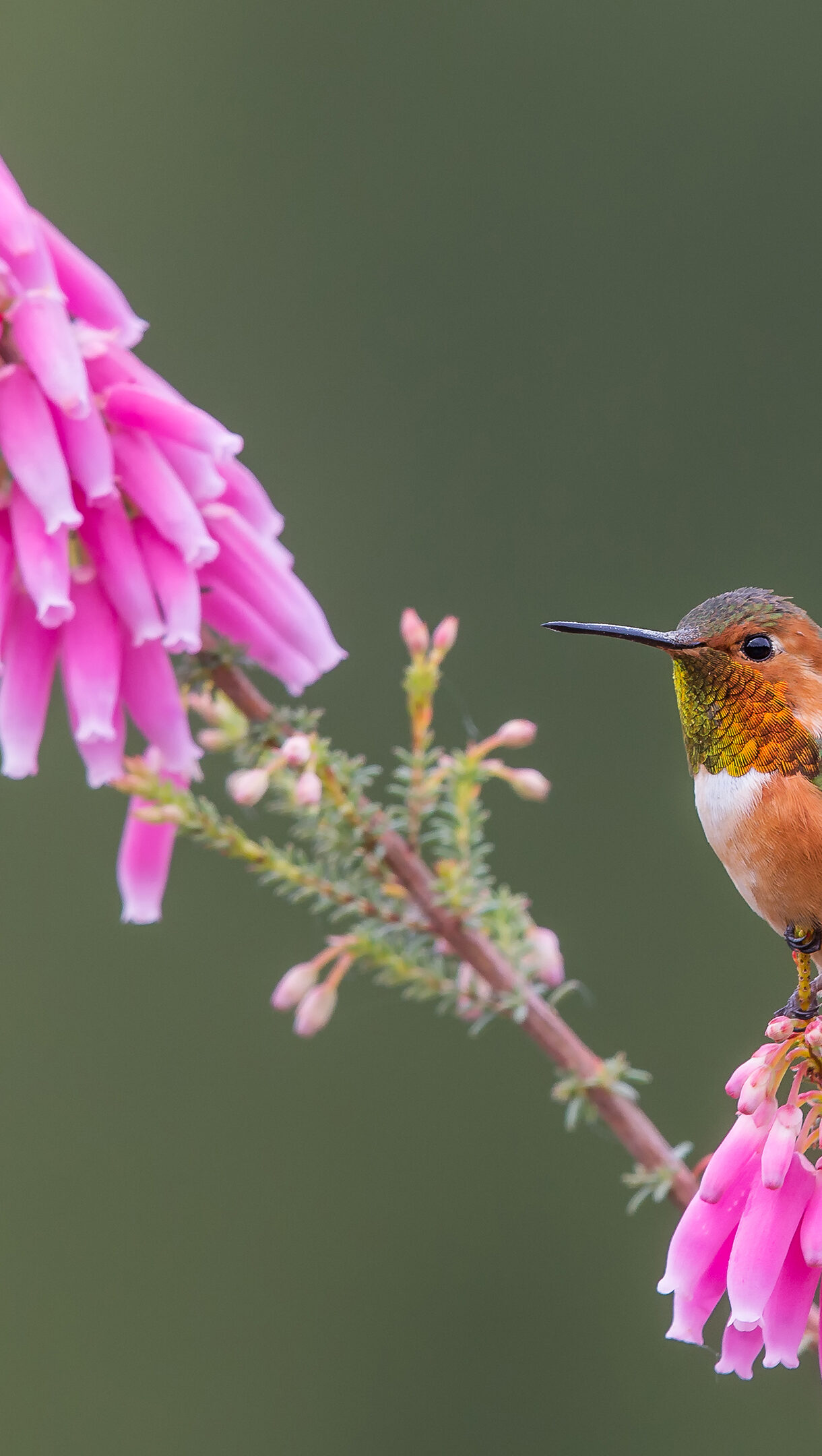 An exquisite 4K wallpaper features an Allen's Hummingbird perched gracefully among vibrant pink flowers in Santa Cruz, California. The bird's iridescent orange and green plumage gleams against the striking fuchsia blossoms, creating a vivid contrast against the soft, muted green background.