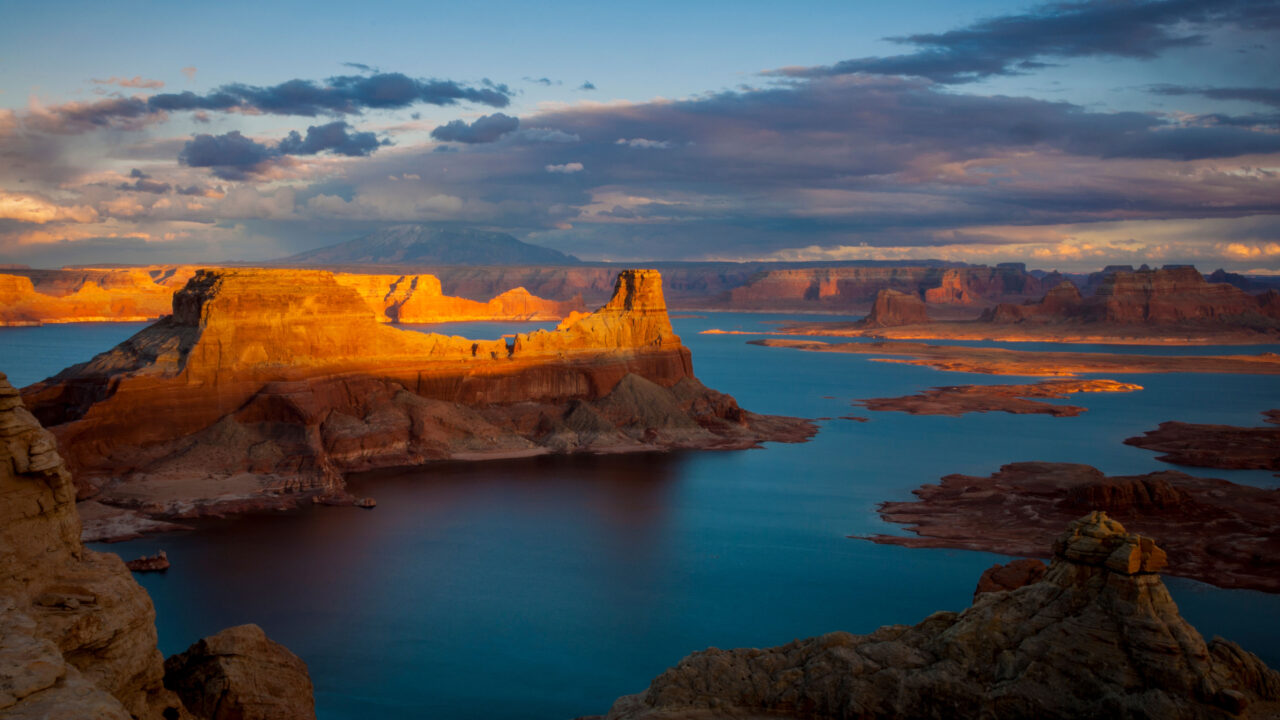 A majestic 4K wallpaper capturing Alstrom Point and the expansive Lake Powell in Utah during a vibrant sunset. The golden sunlight bathes the towering red rock formations, creating a striking contrast with the deep blue waters and the dynamic, colorful clouds above.