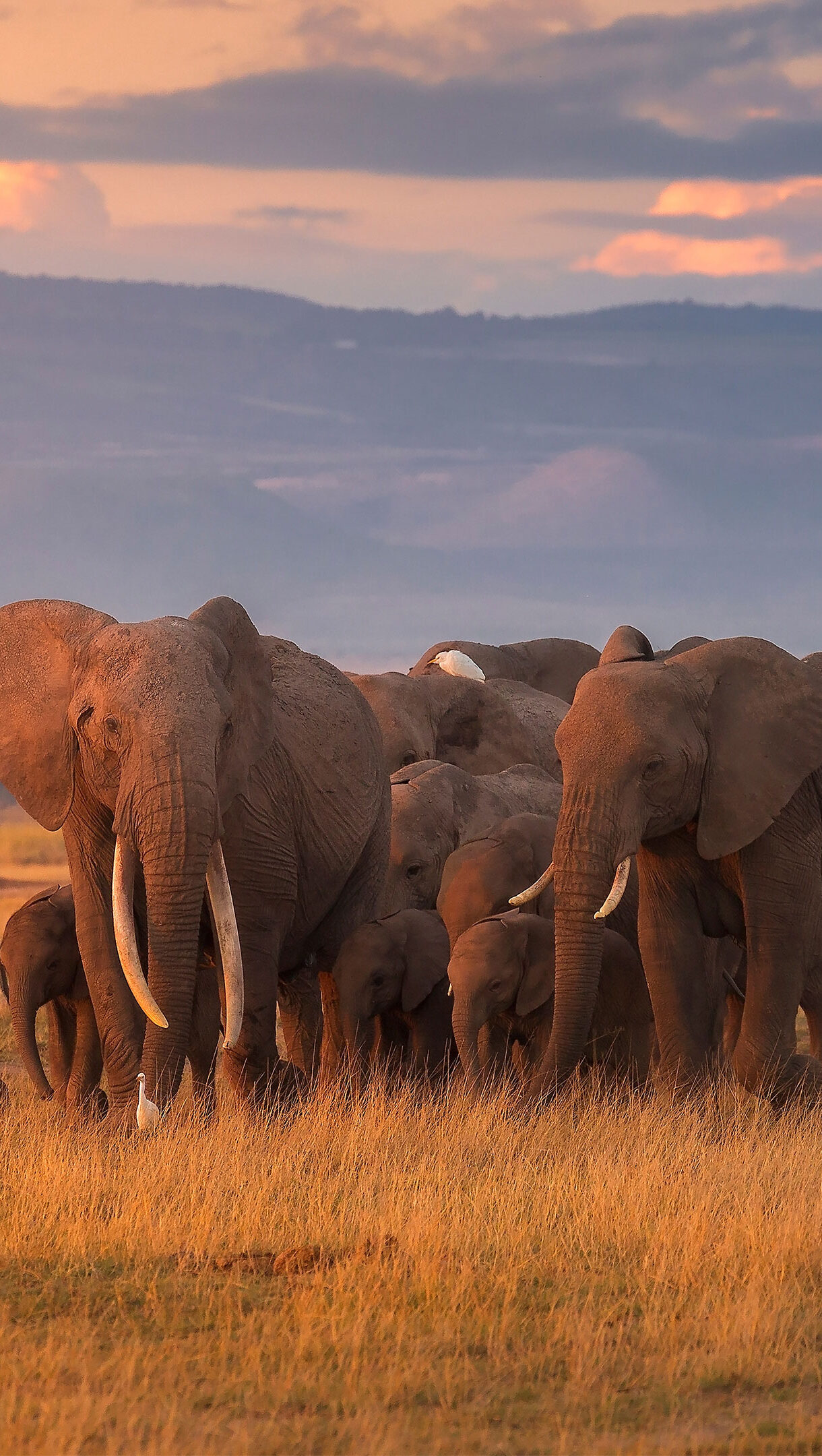 An awe-inspiring 4K wallpaper presents a majestic elephant herd traversing the golden plains of Amboseli, Kenya, beneath distant mountains. The warm, golden light of the sunset bathes the entire scene, enhancing the elephants' presence and creating a serene, powerful mood.