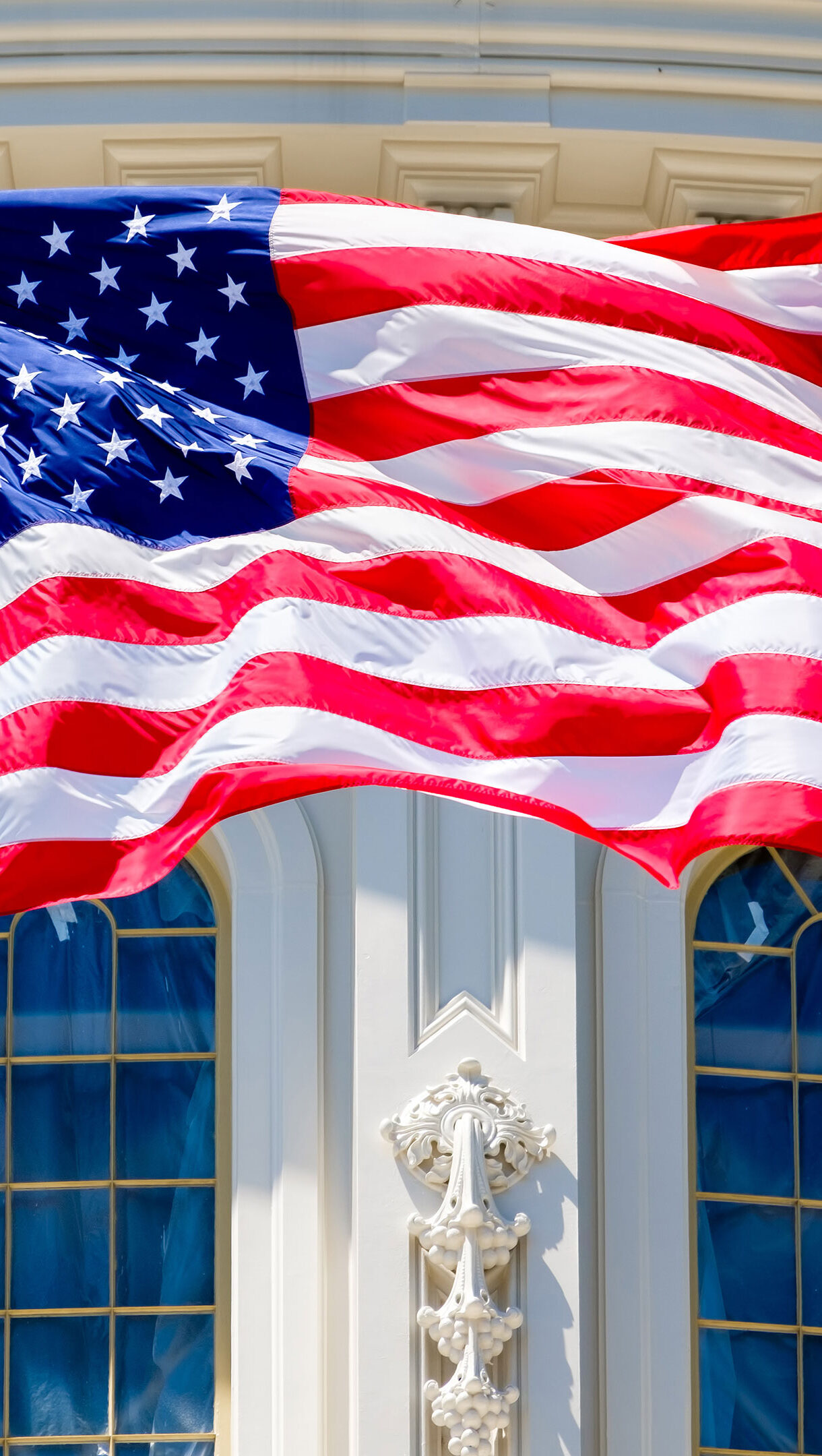 A patriotic 4K wallpaper showcasing the American Flag waving robustly before the United States Capitol Building in Washington DC. The striking interplay of sunlight on the flag's rippling fabric and the Capitol's intricate white facade creates a powerful and iconic scene.